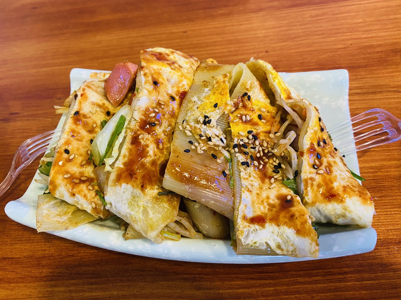 解锁各种酱料后,其实烤冷面本身也有着东北菜的特点,味道和香味都很浓郁。而我喜欢的,是冷面经过铁板翻炒后,散发出的香。再加上烤冷面的特殊口感,嚼起来劲道中带着一丝凝胶式的触感,油脂让淀粉变得更易入口。配上经典搭配洋葱、孜然和香菜,更增添口味的层次感。