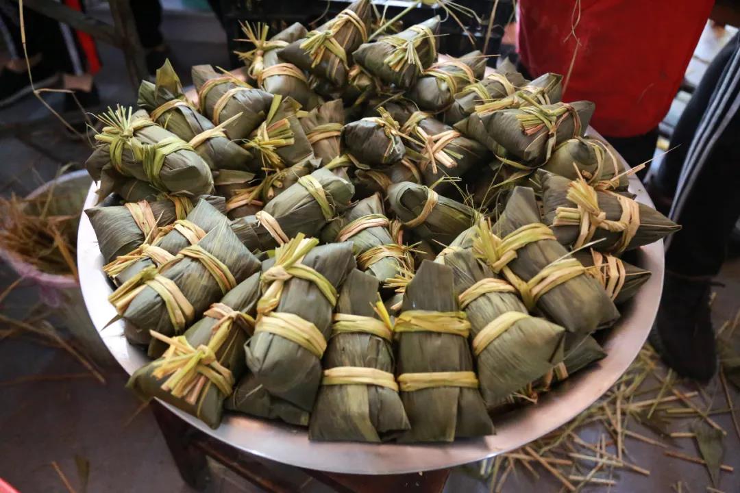 走进位于江川北路153号的店面,五六个阿姨正忙着制作粽子。将两片粽箬对折成斗状,先平铺一层糯米,放上馅料,再附上一层糯米,最后盖上粽箬、定型、捆扎,数秒内,就将一只粽子包好了。阿姨们娴熟的动作与多年来的经验分不开,王佩华介绍,很多阿姨都在店里做了二十多年,正因为如此,才能适应高强度的“端午模式”。