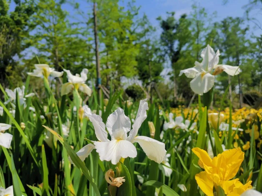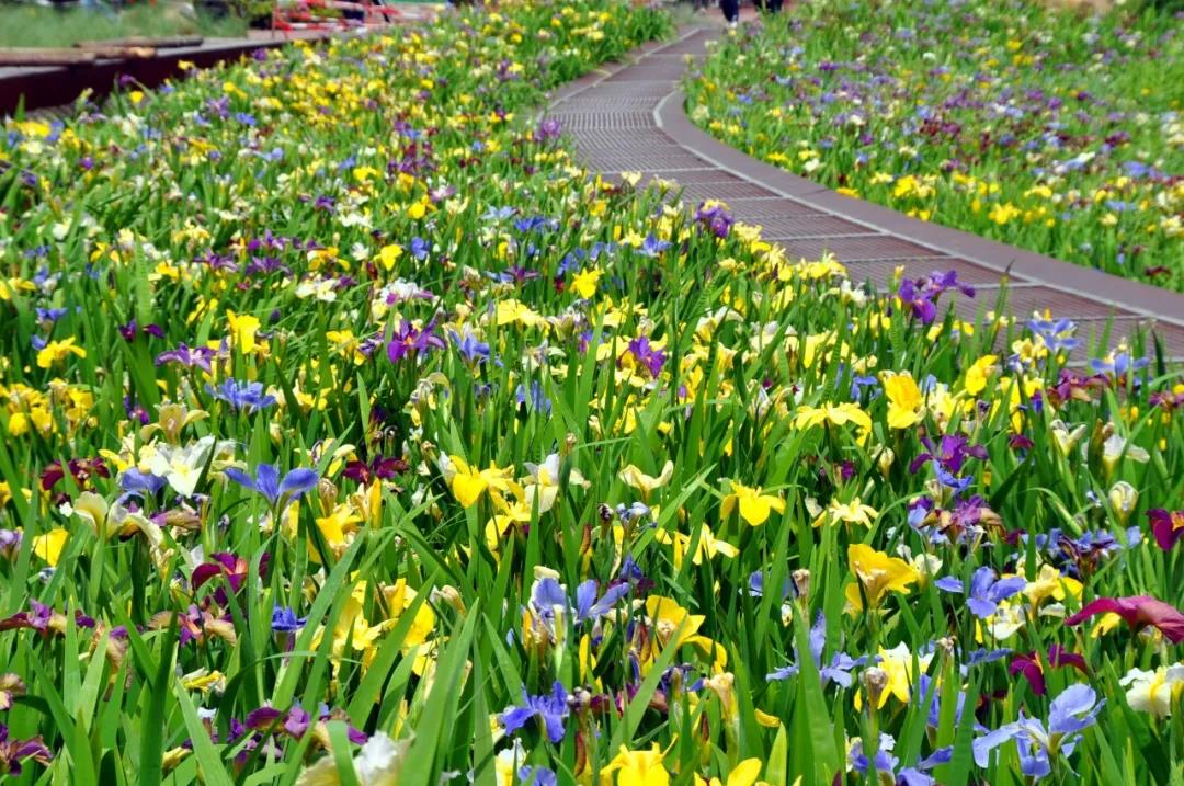 鸢尾作为彩虹湾公园的特色植物,园内种植鸢尾面积约1000平方米,主要品种为德国鸢尾以及路易斯安娜鸢尾。德国鸢尾的花色艳丽,花型优雅高贵;路易斯安娜鸢尾的颜色、形状善于变化,在群花之中显得尤为引人注目。一个花茎上开数朵大而美丽的花,给人威严、华丽之感。如蕾丝边卷曲的花瓣也是它的一大特色。