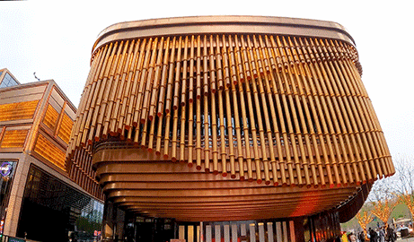 复星艺术中心外墙包裹着三层金色可转动幕帘。整个幕帘从10:00至22:00每隔两小时,配合着优美音乐旋律转动,如同一座“会跳舞的房子”,在风景秀丽的外滩沿岸翩翩起舞,吸引无数人来这里看展拍照!
