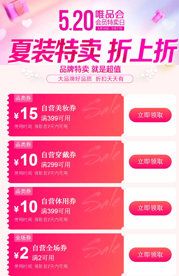 唯品会也有520品类券和无门槛券。