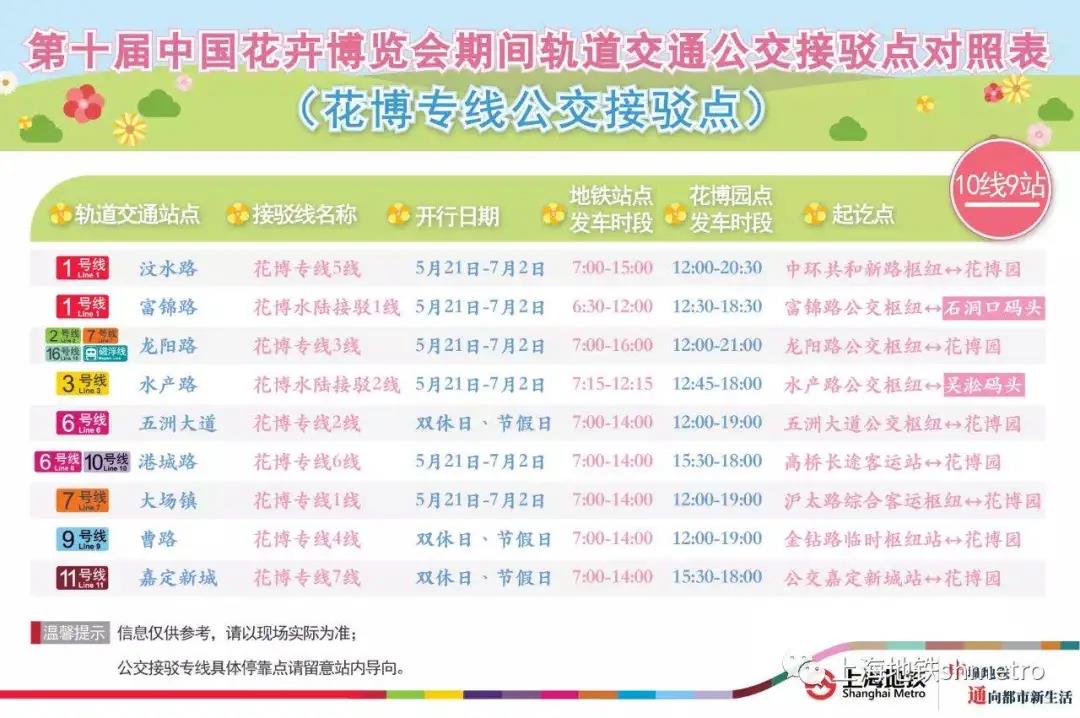 陆路专线和水陆联运线路公交接驳专线在轨道交通10线9站设置公交接驳点,其中陆路接驳站7座,分别为:1号线汶水路站、2/7/16/磁浮线龙阳路站、6号线五洲大道站、6/10号线港城路站、7号线大场镇站、9号线曹路站和11号线嘉定新城站,其中嘉定新城枢纽、五洲大道枢纽、金钻路临时枢纽的3条线路周末及端午节期间开行。花博陆路专线票价为单程为20元。水陆接驳站2座,分别为富锦路地铁站-石洞口码头-新河码头-花博园,水产路地铁站-吴淞码头-新河码头-花博园2条特色水陆联运专线。其中石洞口-新河航线票价16元,吴淞-新河航线票价18元。两端有公交接驳,凭电子船票凭证可免费乘坐接驳公交,直达花博园。