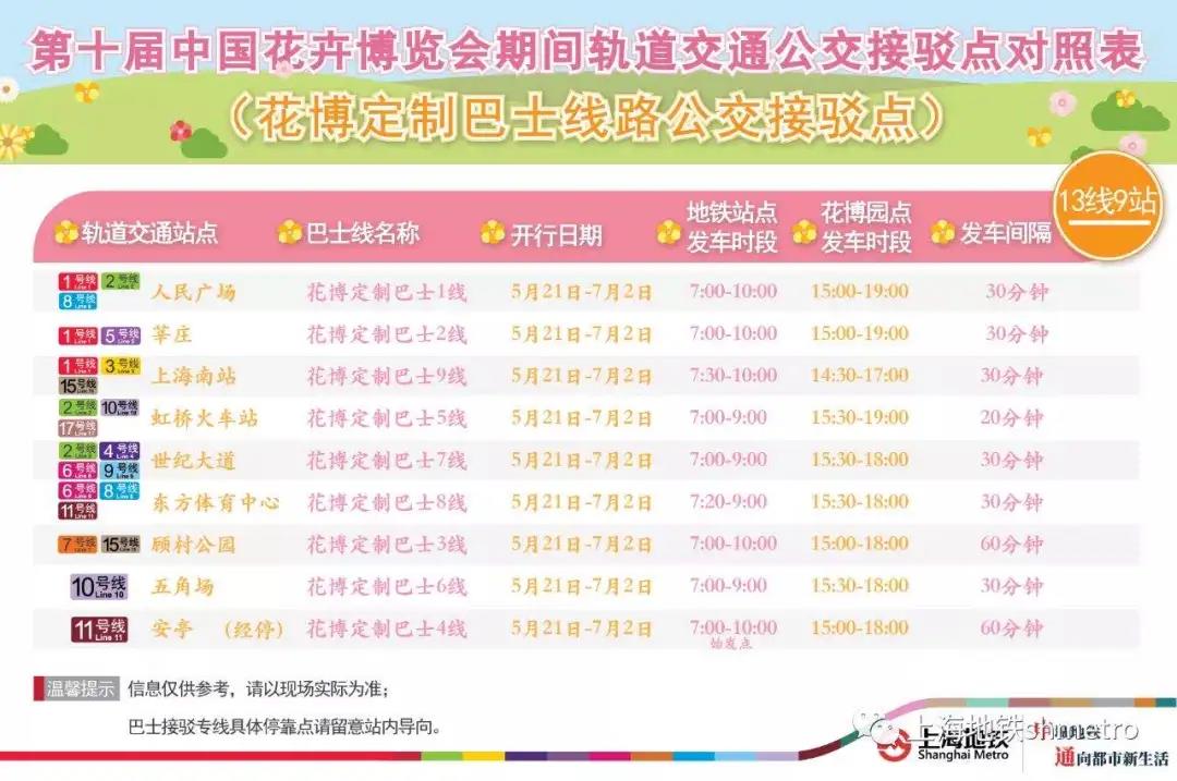 花博定制巴士线路在轨道交通13线9站设置公交接驳点,分别为:1/2/8号线人民广场站、1/5号线莘庄站、7/15号线顾村公园站、11号线安亭站、2/10/17号线虹桥火车站站、10号线五角场站、2/4/6/9号线世纪大道站、6/8/11号线东方体育中心站和 1/3/15号线上海南站站。定制巴士线路以固定班次发车,发车间隔20分钟-60分钟不等。花博定制巴士票价为30元。