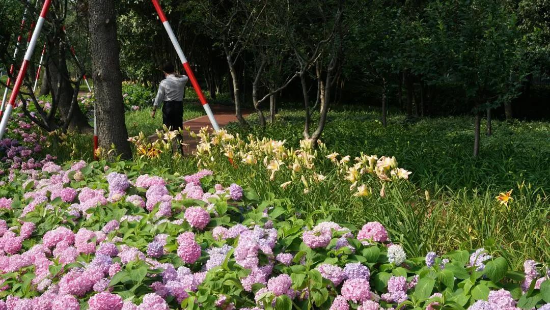 江湾公园内共栽植了500余株八仙花(无尽夏),作为公园的夏季主打花卉,分布在公园各处,种植形式有点状、条状、块状等。今年还尝试了调蓝处理,进入公园,成片的蓝色绣球一定会格外亮眼,给人一种夏季清凉的感觉。