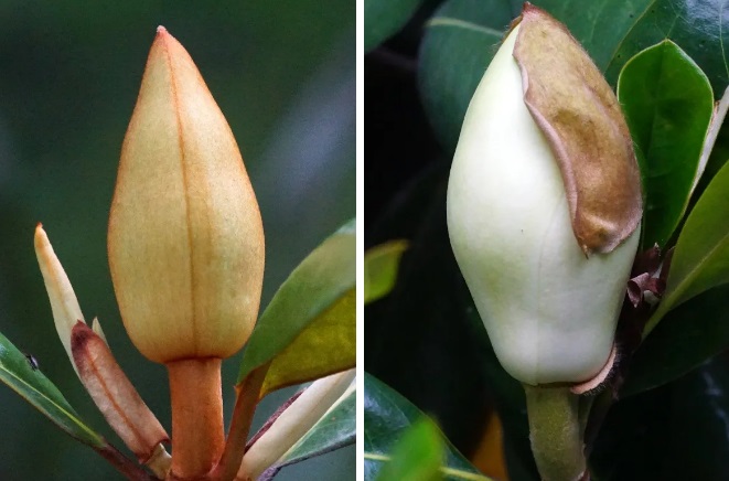 荷花玉兰芽、幼枝、叶背面、花苞外苞片均密被锈色绒毛。