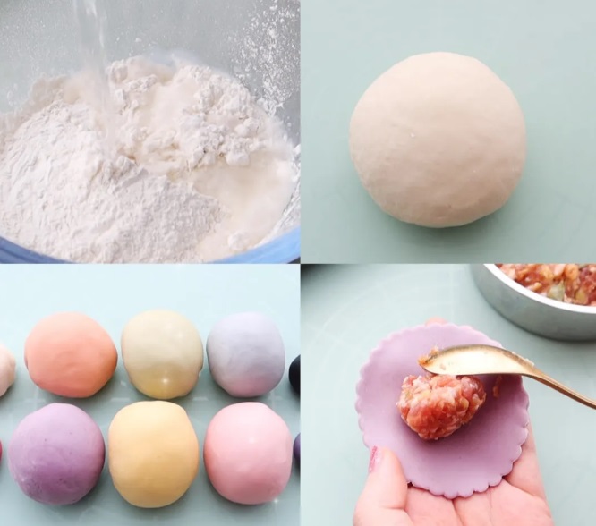 面粉加水或牛奶和面揉成光滑面团,分割调色,擀皮,压出直径7cm的花边圆。当然也可以按照宝宝的喜好,擀成他们想要的形状。
