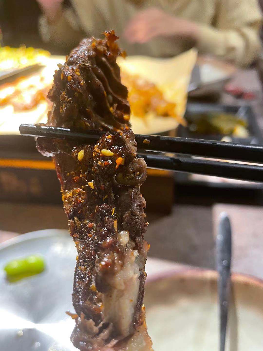 我用筷子夹了一小块没有骨头的肉,有点烤糊的感觉,可能是因为肉比较薄,让烧烤师傅不好掌握火候?接下来尝了一块正宗的鸡骨架,口感好多了,不过肉确实不多,需要双手和嘴巴配合,在骨头缝隙里寻找鸡肉。