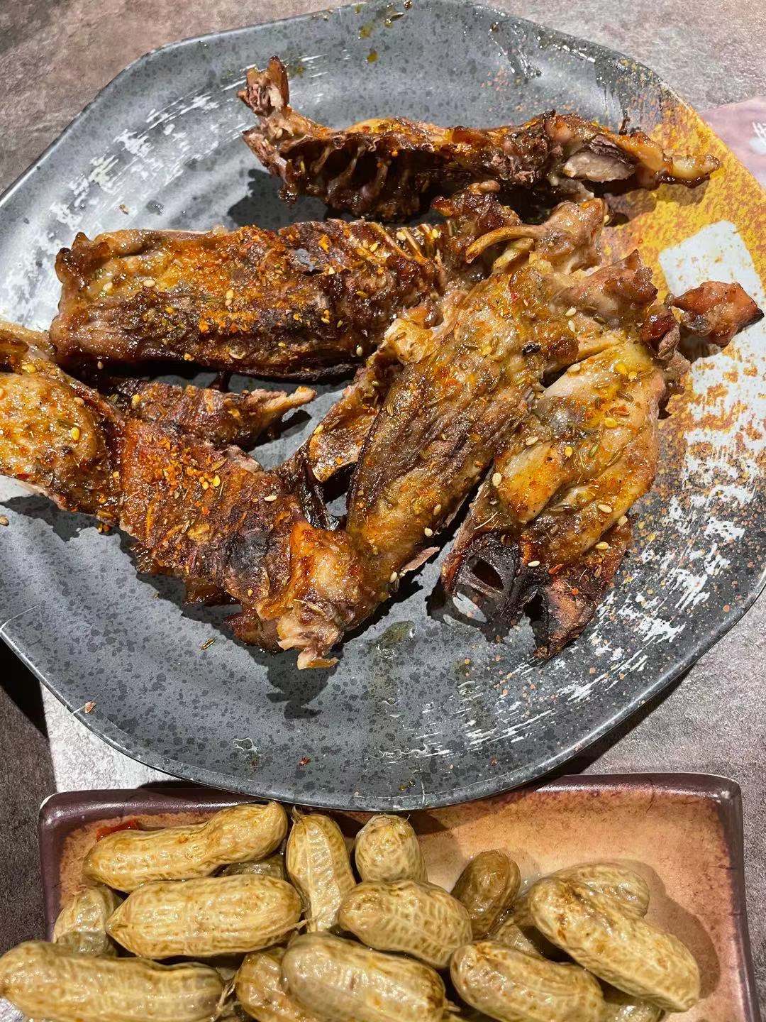 点好菜,肉串先上来了,开吃后大概十多分钟,主角鸡架上场了。价格不贵,一盘鸡架18元。