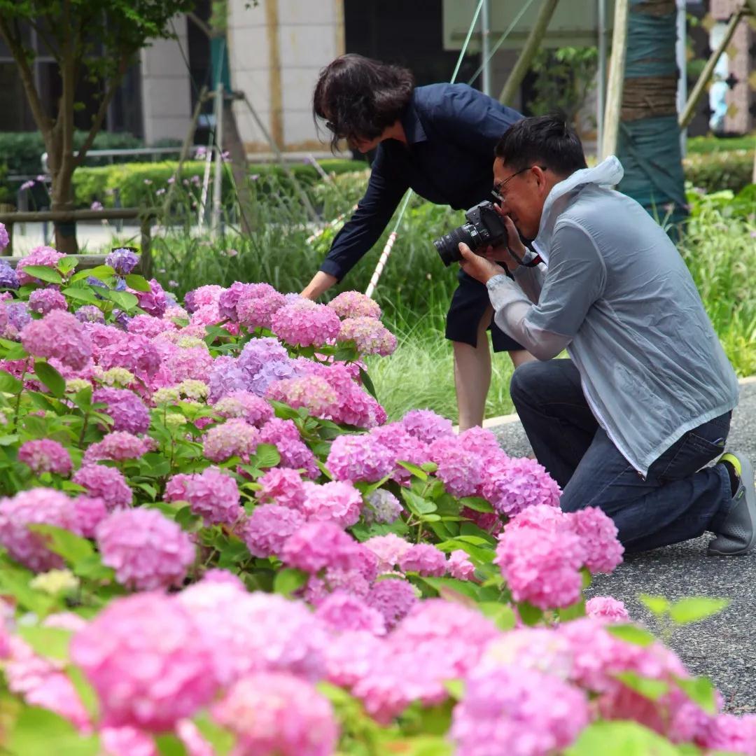 白色的绣球花纯洁无瑕,粉色的温柔浪漫,还有优雅高贵的蓝色、温馨唯美的紫色,展示了希望、浪漫、高贵、团结的美好寓意。引得不少市民停下脚步,拍下这夏日的浪漫。
