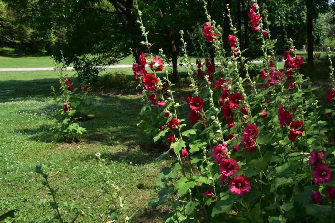 观赏点位:在共青森林公园足球场东侧林缘,以大红色为主的蜀葵花,以自然式的布局方式三五成丛地点缀着,在绿荫空阔的大草坪上尽情展现其自然之美。
