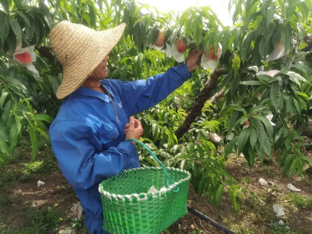 在白鹤镇合作社的桃园内,连片的桃树枝繁叶茂,枝头上硕果累累,散发出诱人的桃香味。果农们头戴遮阳帽,轻轻撕开套在果子上的防光袋,一颗颗白中透粉、毛茸茸、圆嘟嘟的水蜜桃便露了出来。果农小心翼翼地采摘下来,放入篮中。