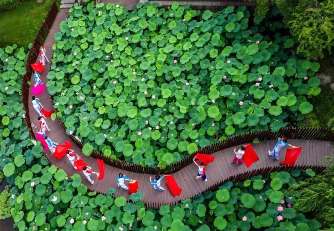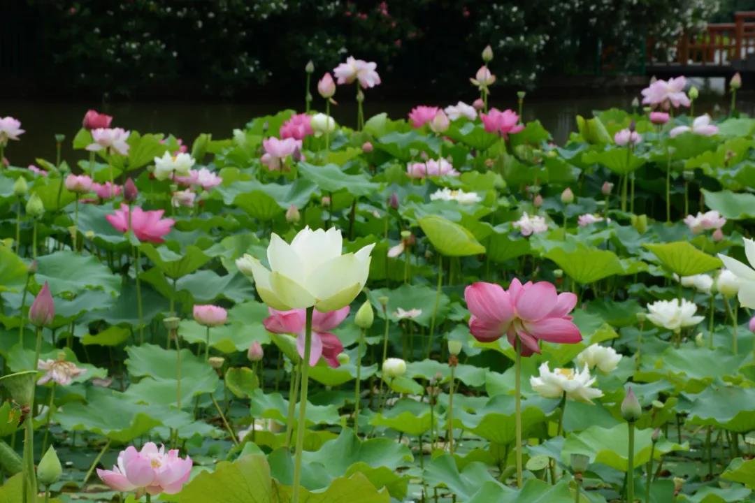 在嘉定,有一处园子以荷花闻名。每年夏天,1000多平米荷花争相绽放,舞妃香、红舞裙、紫玉、粉玲珑......缸栽荷花与池中荷花联动,湖中有景,岸上亦有花。这就是陈家山荷花公园!