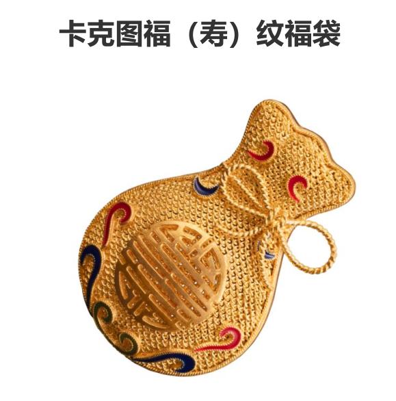 举一件作品实例,老凤祥“福(寿)纹福袋”金饰。它包含花丝工艺、卡克图、錾刻等手法。“福袋”在中华传统文化中具有代表性,起源于秦朝,兴盛于汉唐盛世。福袋上小下大、袋口紧束、肚大且圆寓意聚福聚寿、代代长寿、代代有福。圆寿图颇具深意,“寿”自古以来被世人重视,“寿”字在传统吉祥文案中运用变化多、应用广。