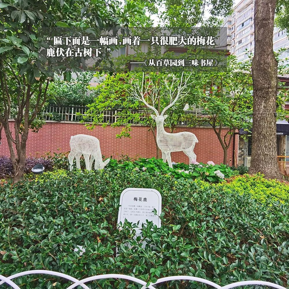 从百草园到三味书屋,从乐章奏起,到对鹿行礼,配植文中提到的皂荚、桑、薜荔等植物来契合设计主题。放置207块植物铭牌于花园的各个角落,主要乔灌木新增植物科普二维码。