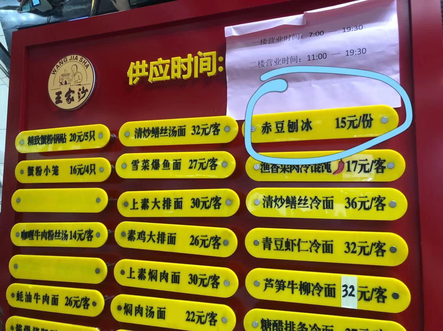 而王家沙一直以来只卖一种刨冰——赤豆刨冰。厨师介绍:赤豆是每天现熬的,保证新鲜。与从前不同的是如今的刨冰增加了一些食材,比如:炼乳、玉米粒、菠萝粒、葡萄粒等,口感更丰富了些。啤酒杯形状一样,但材质不一样了,改为透明塑料的了。