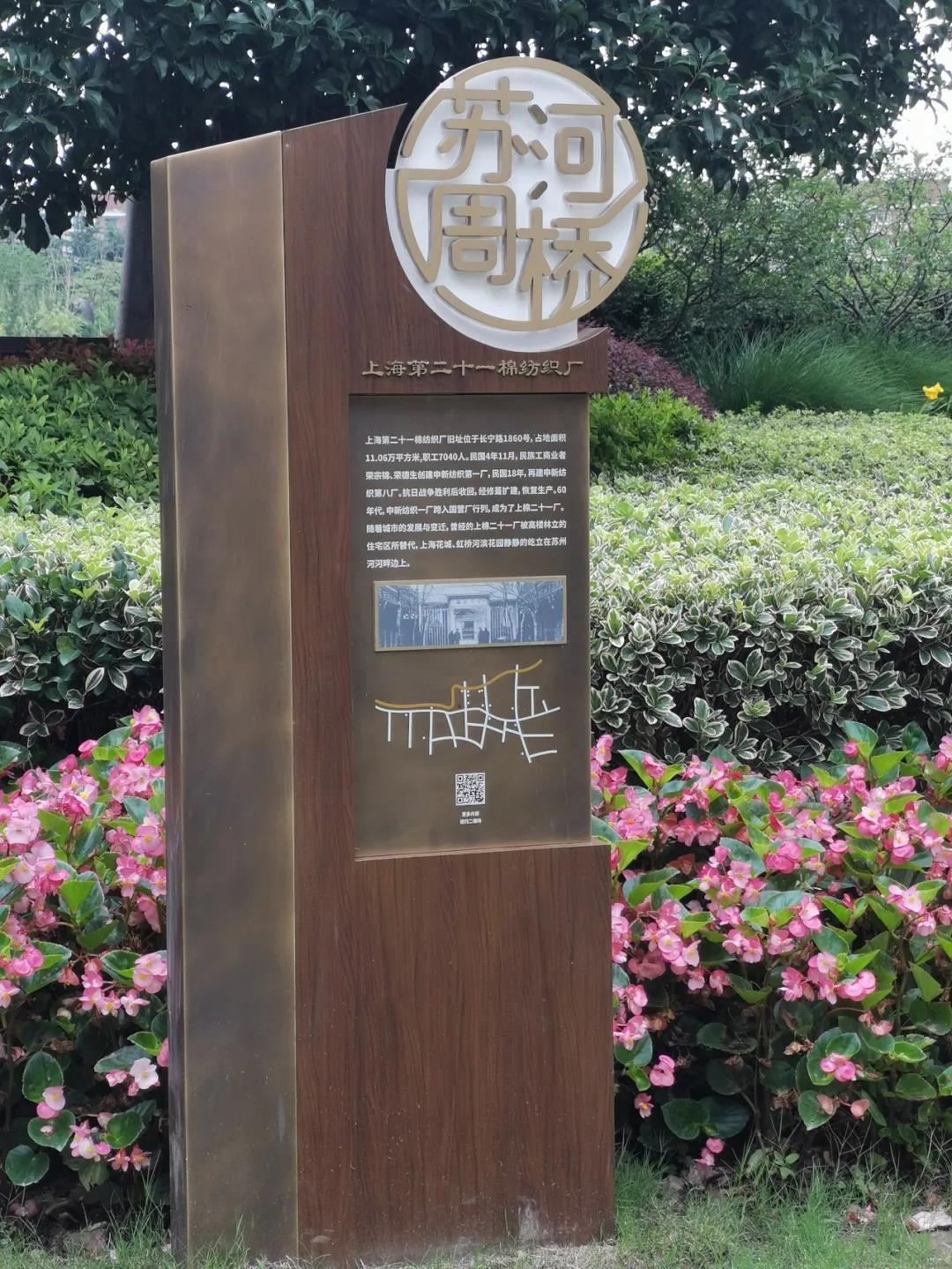 对护航号、三十七民众夜校、第五棉纺厂、丰田纱厂、强家渡口、煤球八厂、苏河驿站、瞬间雕塑、周家桥米市、天原化工厂10个红色印记、民族工业点位安装铭牌导览文字和图案。