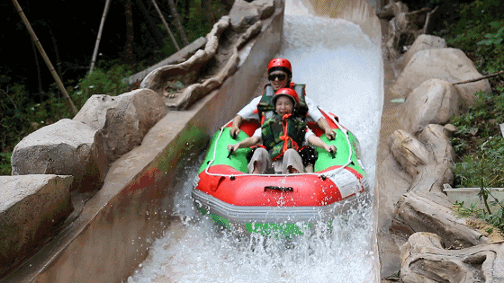 龙出没穿越漂流全长足足有2000m!宛如一条飞龙蜿蜒在茂密山林之中,丛林坡道较自然峡谷弯道要平缓和安全很多,各个关卡处都会有专业的工作人员保驾护航,小朋友也能玩。大大小小的十几道关口的轮番挑战激起的浪花让人透心凉,关口的蛟龙滑翔、过弯漂移、自由落体也能小小挑战一下小朋友的胆量和冒险精神。