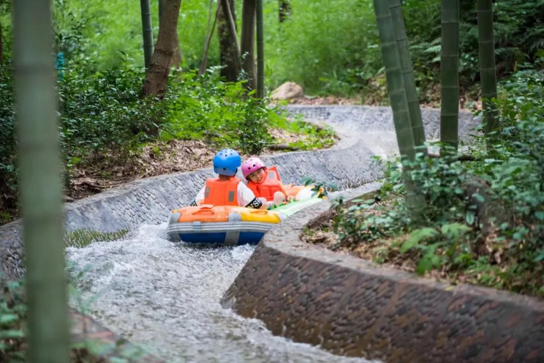 安吉的漂流地段很多,来安吉不去漂流实在说不过去, 浙北大峡谷漂流全程共2.5公里,漂流时长约1小时左右,一共6个滑道,有50米的落差,总体都是比较平缓的滑道,可以放心带小朋友一起玩。