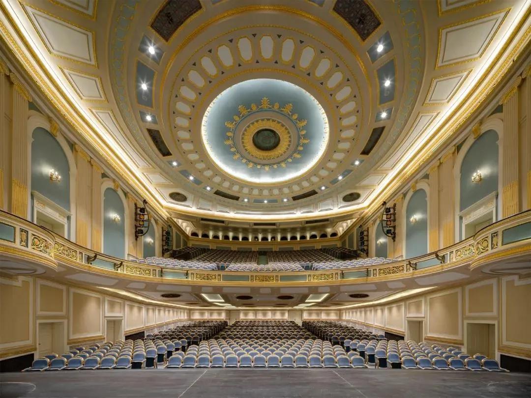 在最近的一次修缮中,为了将它复原至90年前的模样,技术团队进行了拍摄扫描,逐块对比选色,再通过人工手绘的方式还原。穹顶造型天花及顶角线出现老化、变形、饰面开裂问题,修缮中也以纯手工的方式进行了修补与加固。穹顶还贴上了800多处金箔,更加富丽堂皇。