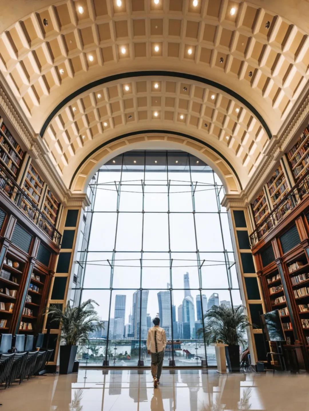 落地窗连接14米挑高的拱形穹顶,衔接穹顶两边的则是直冲天花板的深色书架,有着文艺复兴时期的特有韵味。