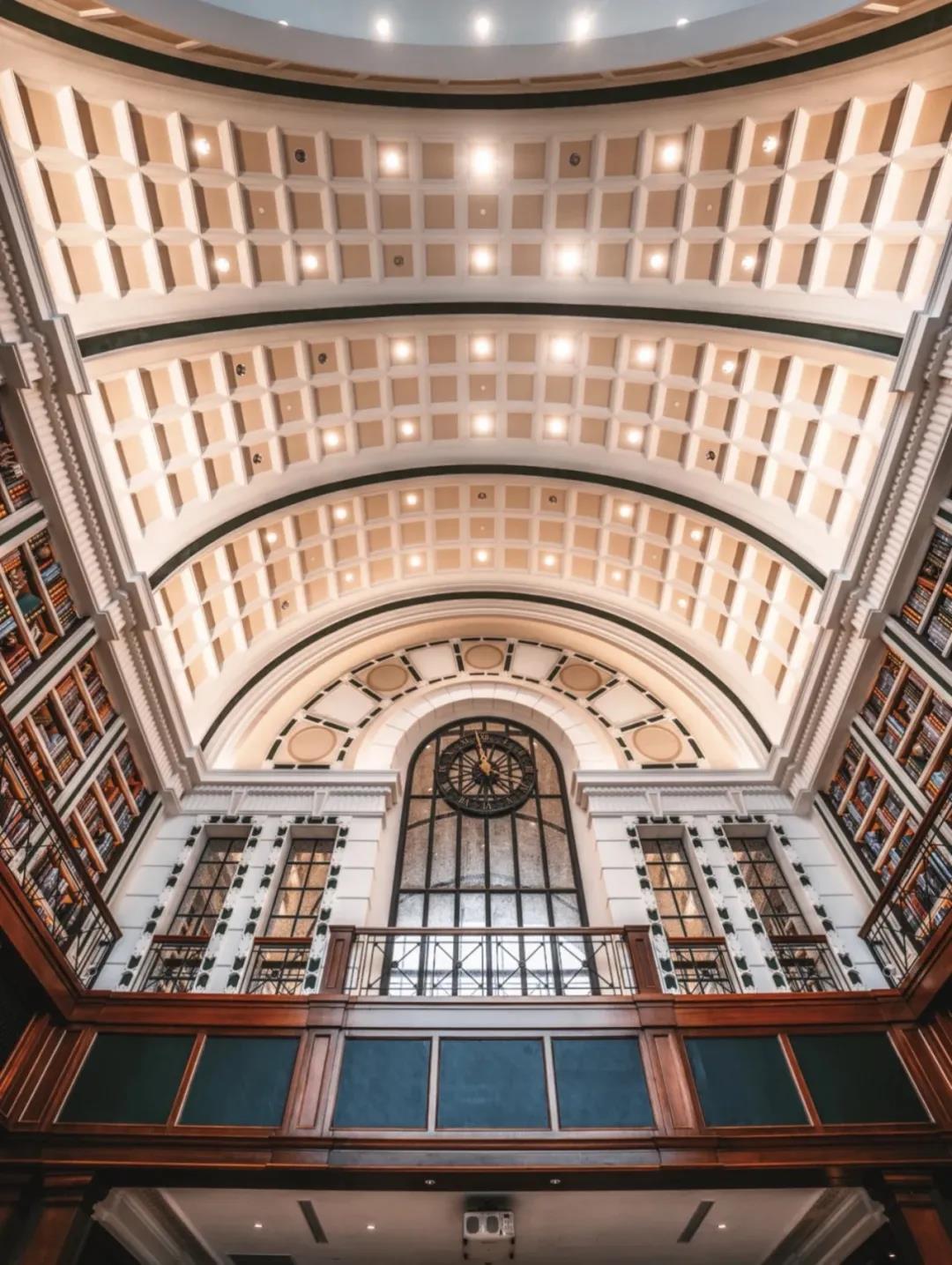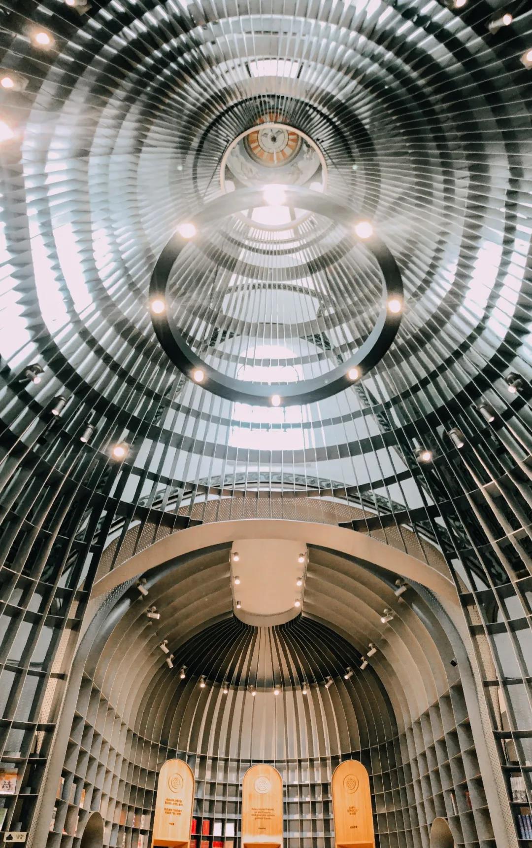 百年教堂、洋葱顶、半圆拱……将典型的拜占庭式建筑的神秘色彩,展现给来到这里的读者。十余米的金属书架一直延伸至白色穹顶,一束光透过玻璃穹顶的壁画便如梦似幻映入眼帘,圆形吊灯从穹顶垂下,好看至极!