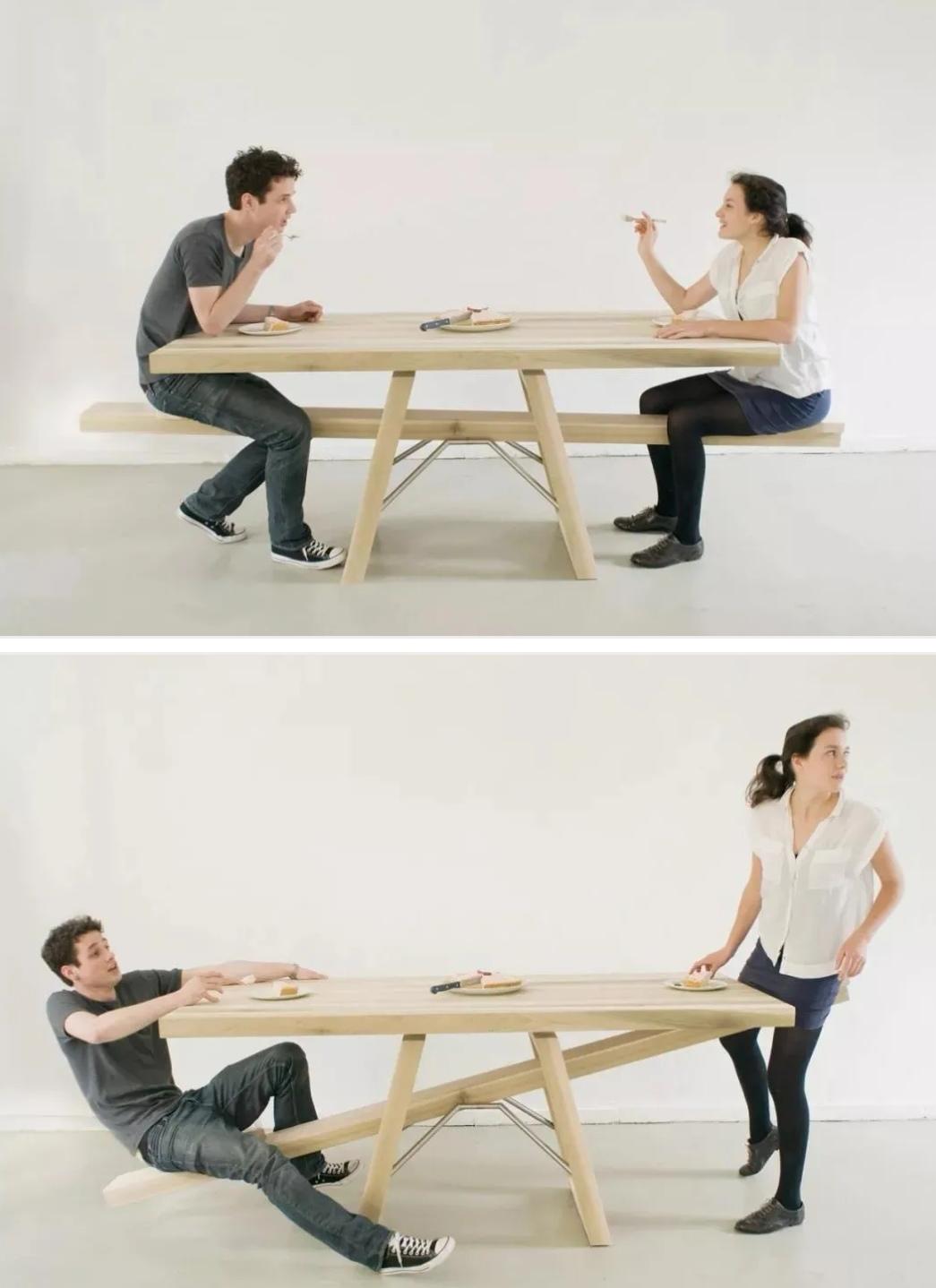 坐在椅子两端的恋人,倘若谁想要中途离开,那可不是一个好主意。所以这款桌子,正在帮助你争夺恋人全部的注意力。