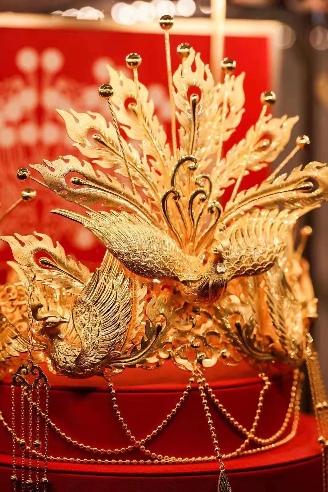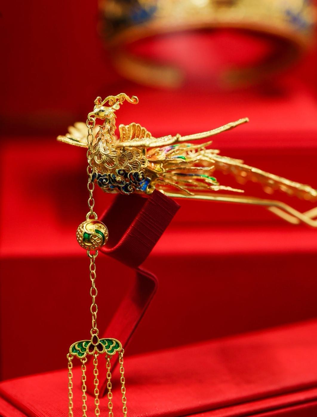 “绣风华—点羽”系列,弘扬了中国传统文化精髓,焕新品牌技艺,融古韵与现代国潮于一体。该系列历经三年研发,留“点”换“翠”,将点羽、刺绣、古法和珐琅等工艺集一体。“古法藏宝金”系列,采用古老铸造工艺,重现独特韵味黄金技艺。经典产品“龙凤佩”蕴意吉祥、和谐美好,古法工艺延续返璞归真的国风情怀。老凤祥取材中国传统婚嫁文化,不仅主打婚庆市场,更向大众美好生活所有“喜事”延伸,打造中国人喜事必备单品。“凤舞九天—金凤冠”系列,则采用古法工艺结合现代精工科技创新研发,尽显“国潮时尚风”。