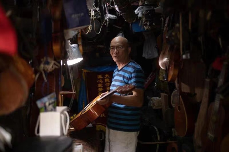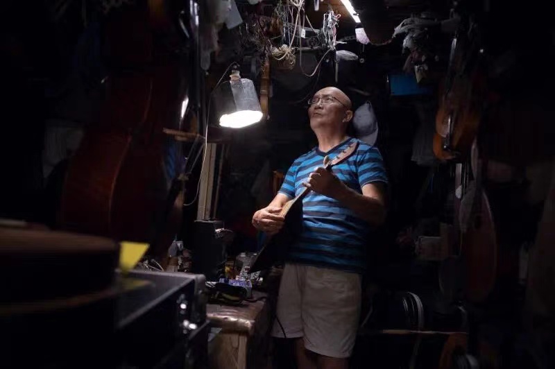 开几了十年修理乐器铺的老板冯顺成正在弹奏巴拉莱卡琴。