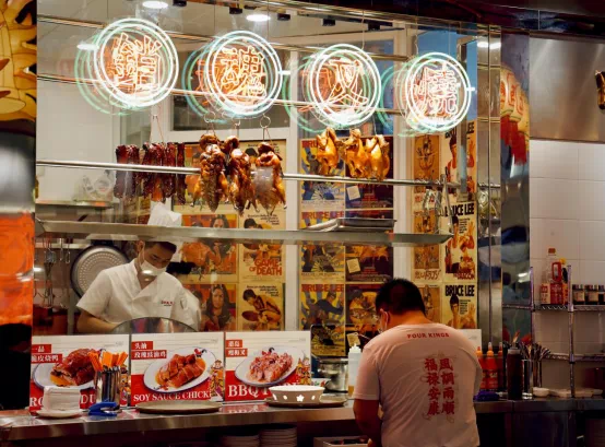 向里张望,店铺不大,但氛围感十足,经典的格子墙砖搭配四人卡座,霓虹灯的烧腊间,盘旋在餐厅正中的龙头灯笼无疑是点睛之笔,还有四大天王的BGM,妥妥的九十年代港风,让人梦回“古惑仔”电影的黄金时代。