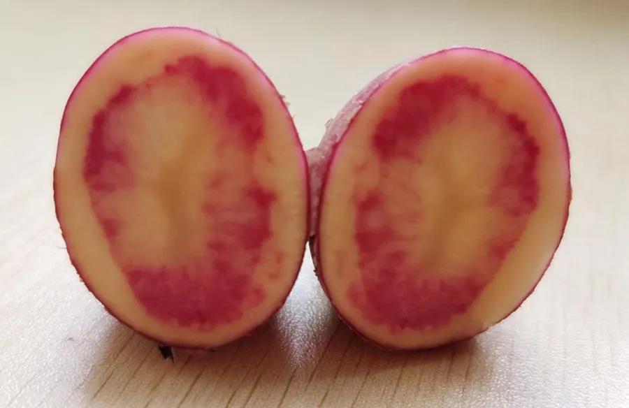 七彩土豆表皮是红色的,切开后内部呈放射状紫红色,层次分明,它独特的花心纹路,使其像一朵盛开的紫红色玫瑰,因此它也被叫做“花心洋芋”。