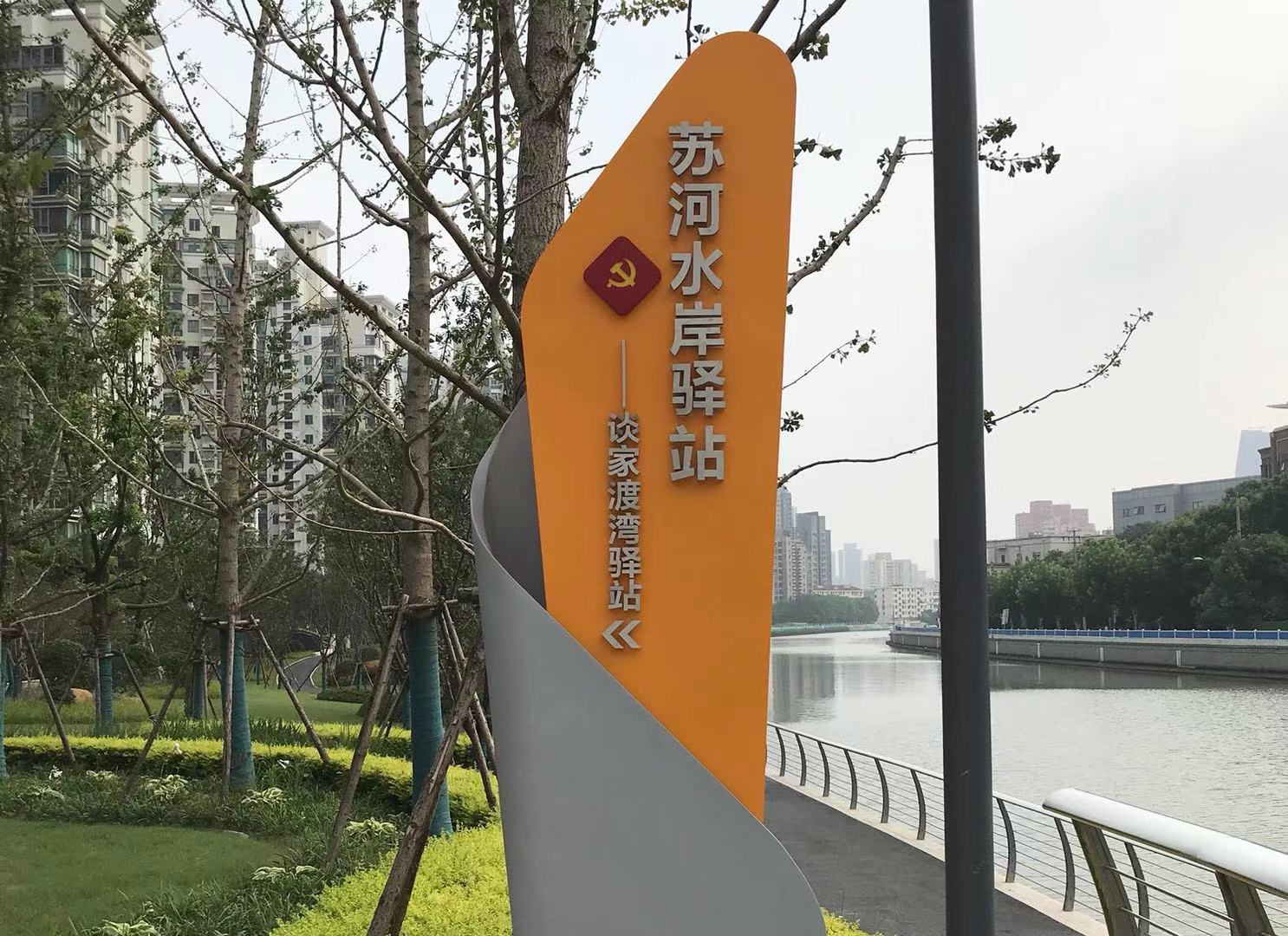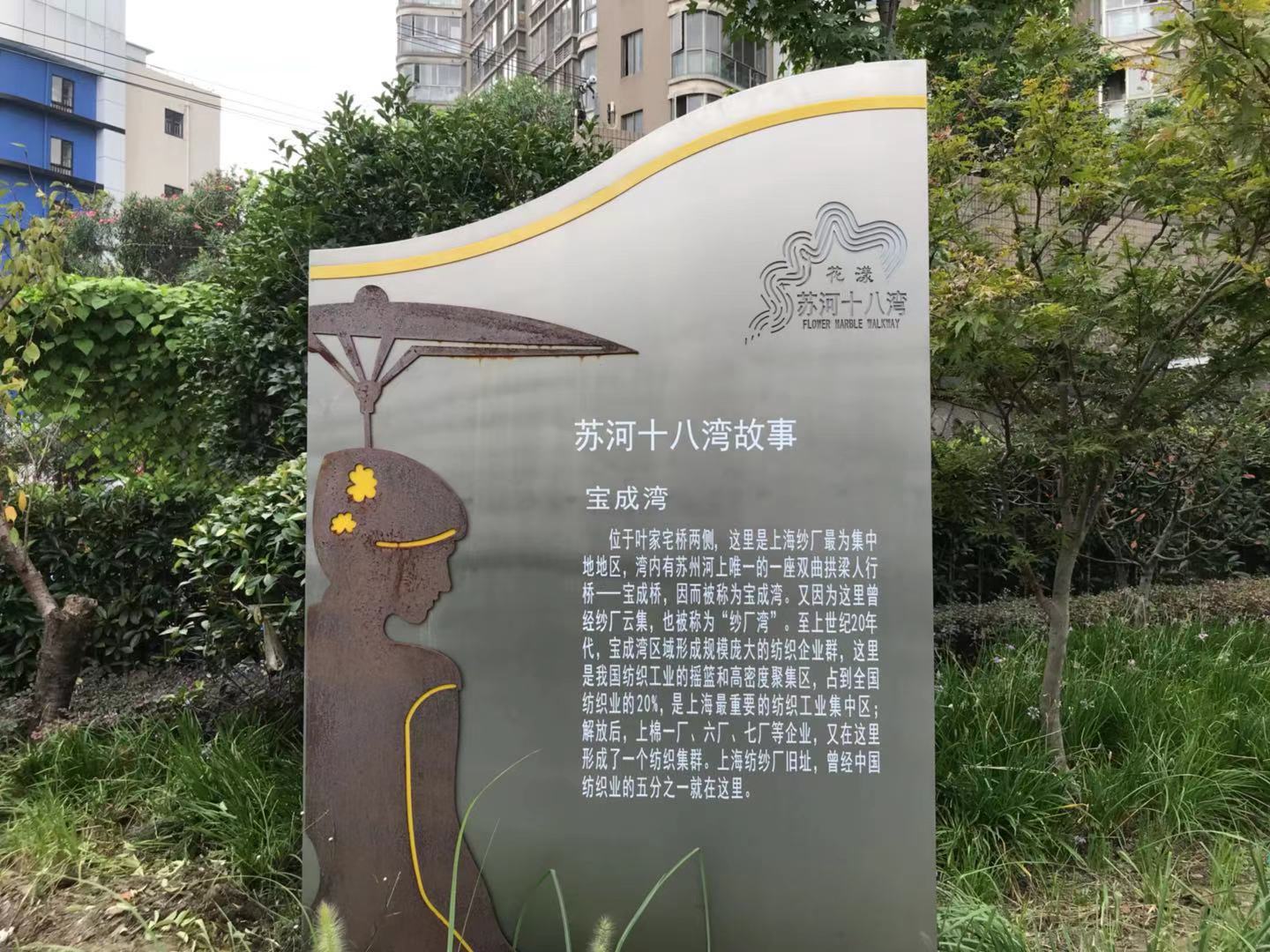 穿过武宁路桥到达宝成湾,“至上世纪20年代,宝成湾区域形成大规模的纺织企业群,这里是我国纺织工业的摇篮和高密度聚集区……”一副简介牌印入眼帘。