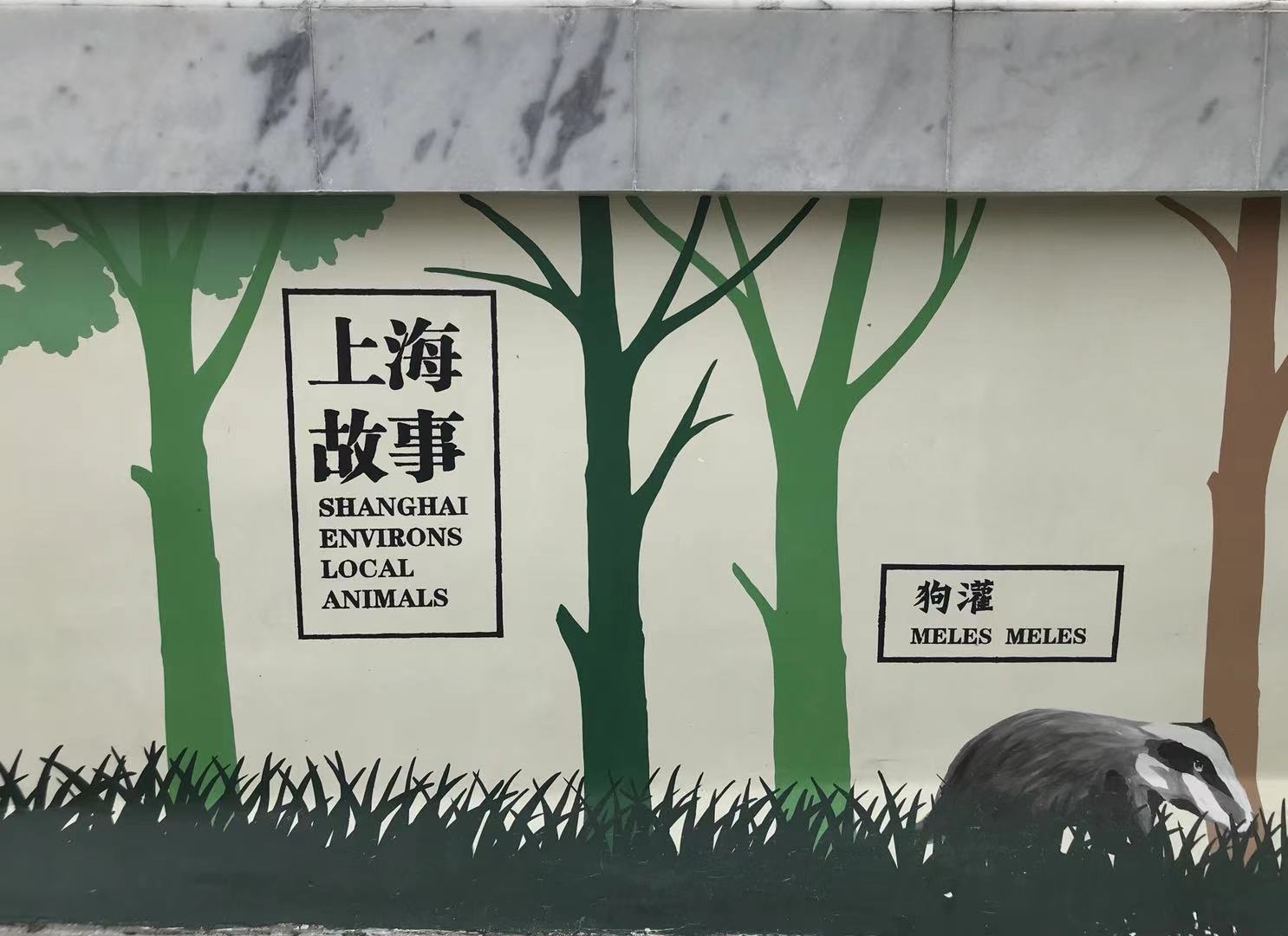 连通着谈家渡湾步道的,是条条曲径通幽的上海绿道,绿道旁的墙上印着“上海故事”,“狗獾”、“麂”等动物的图文解说供行人游客驻足观赏。