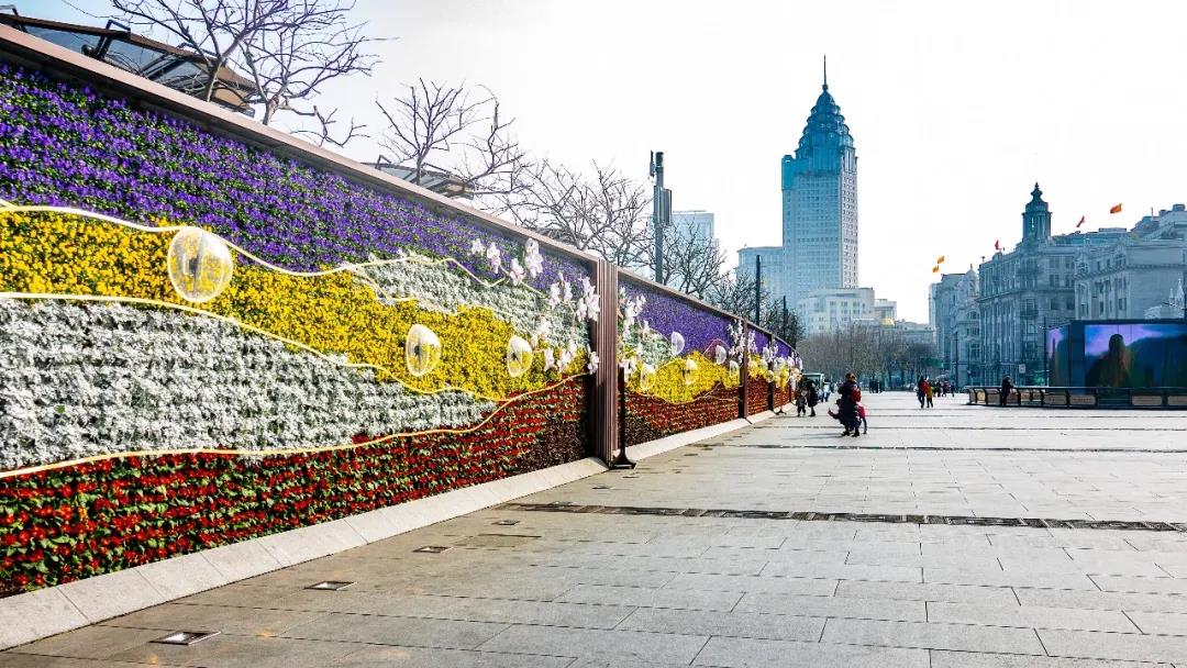 沿着延安东路向外滩方向,更能欣赏到“千里江山”主题花墙。应用各色时令花卉以及3D全息投影技术结合打造的外滩花墙,展现了广阔深远的千里山河境界,意象精微而韵味幽远。