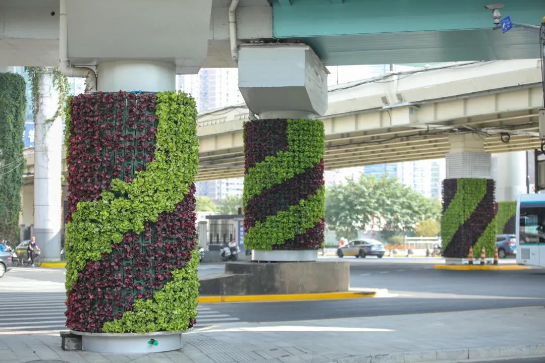 成都北路大沽路高架桥柱以“绿光城市”为设计主题,采用城市森林的设计元素,营造自然有趣、意境上佳的“公园城市”氛围。