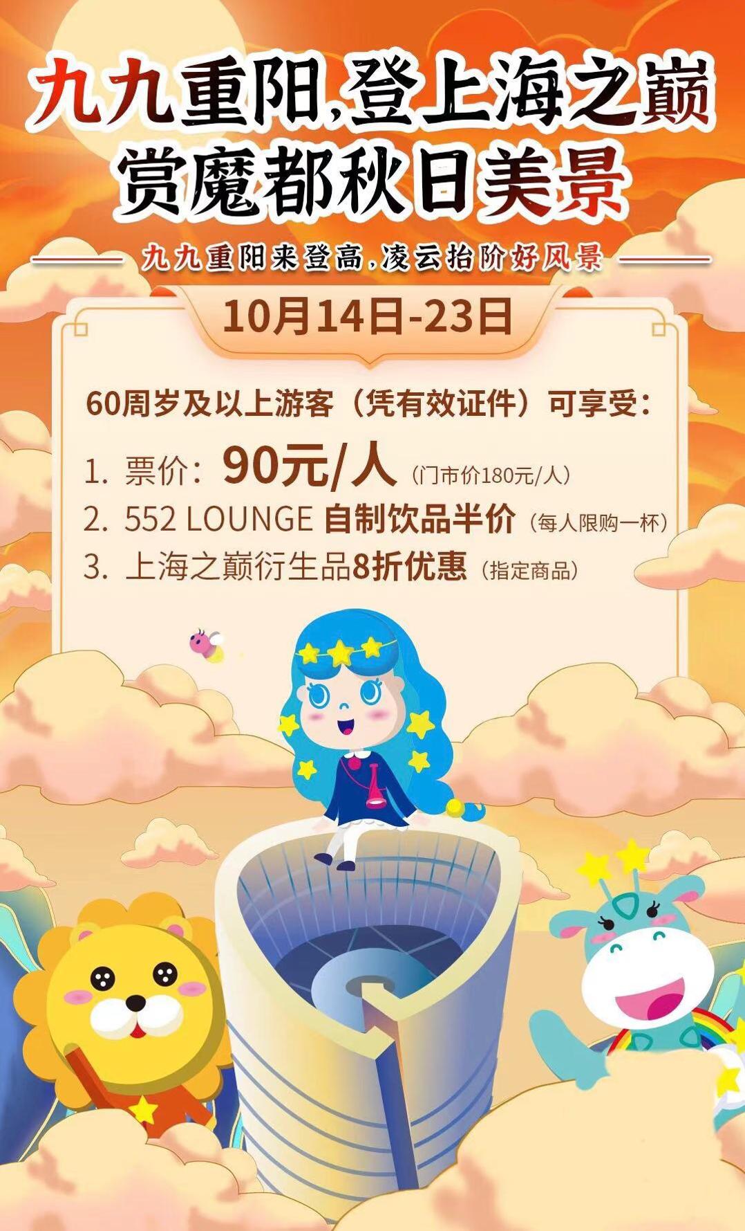 10月14日-10月23日,60岁以上游客凭有效证件前来上海之巅观光厅即可享受门票优惠90元/人(门市价180元/人),119层心上552餐厅自制饮品半价(每人限购一杯),还可享受上海之巅指定衍生品8折优惠。