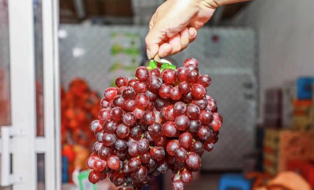 新疆玫瑰香葡萄晶莹如红宝石,巨峰葡萄、阳光玫瑰葡萄颗颗粒大饱满,整齐码放的“葡萄柚墙”“香蕉墙”,让整个市集都充满了香甜的气息。