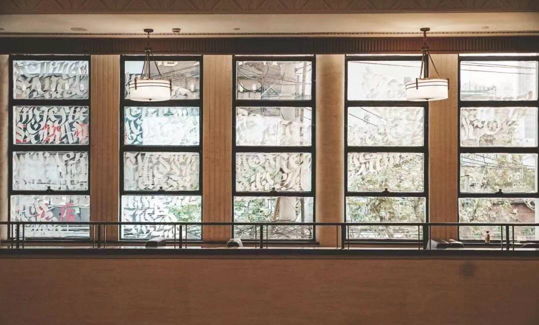 以《美月琪花Moon over miami》歌词为内容的西文书法,在美琪大戏院的临街玻璃窗上绘成了布氏鲸与中华白海豚的游动身影。