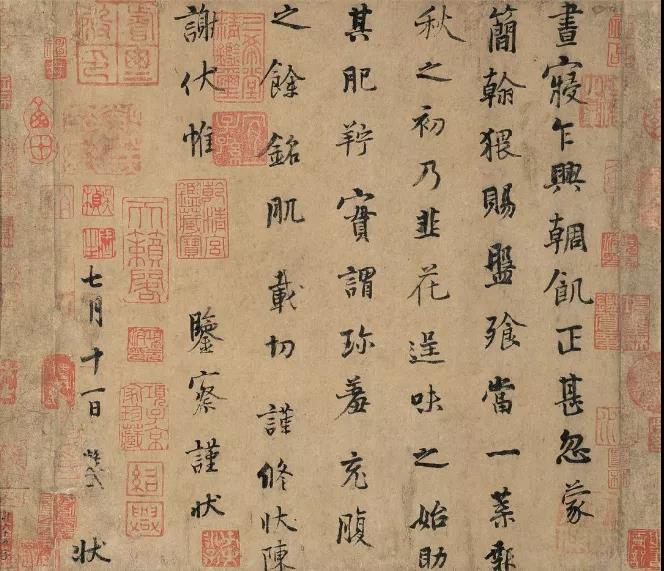 “昼寝乍兴,輖饥正甚,忽蒙简翰,猥赐盘飧。当一叶报秋之初,乃韭花逞味之始,助其肥羜,实谓珍馐,充腹之余。铭肌载切,谨修状陈谢伏惟鉴察。谨状。七月十一日,状。”