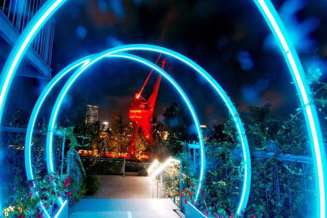 巨型塔吊变身闪亮的公共舞台,水厂栈桥出现发光“水立方”,古老的油罐上映射出上个世纪的工业场景。