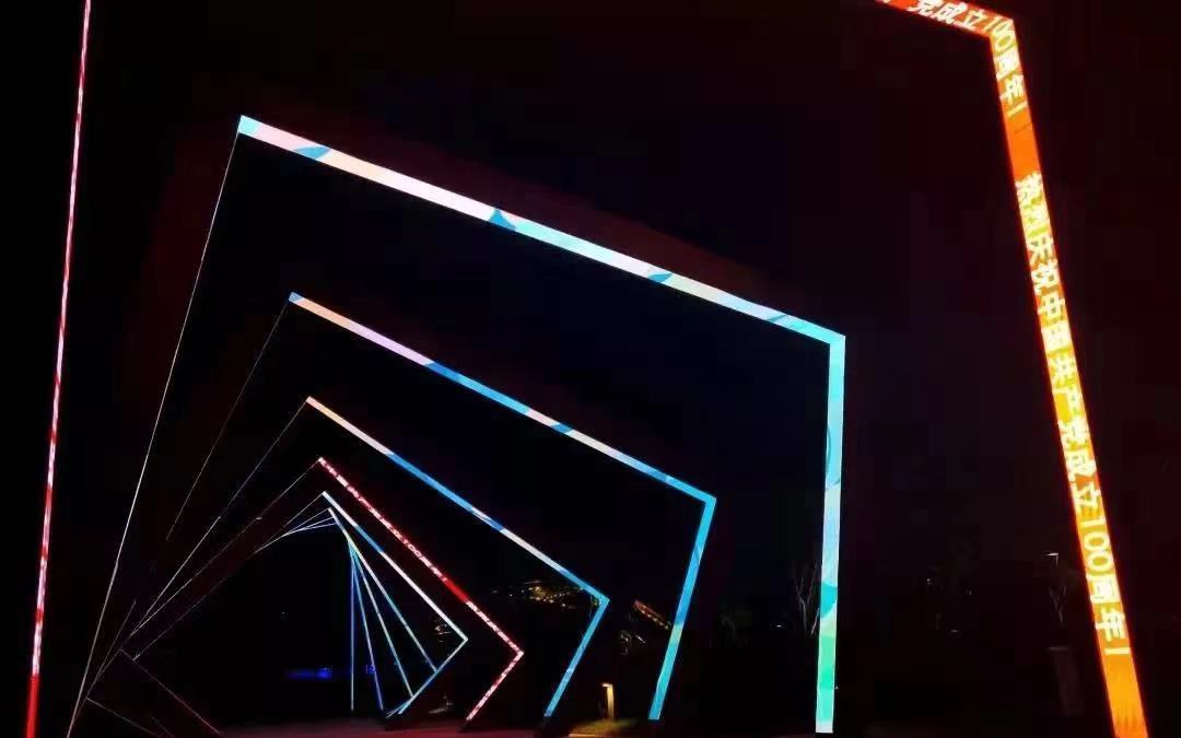 高低旋转角度不同的10重金属门,每一个门代表了10年的时间跨度,寓意着中国共产党成立100周年。当你穿行于艺术装置之中,会逐渐触发临近门内的光影效果变化。不仅如此,作品的说明板上方内置有拾音器,您说的话语可以触发特别的显示内容。
