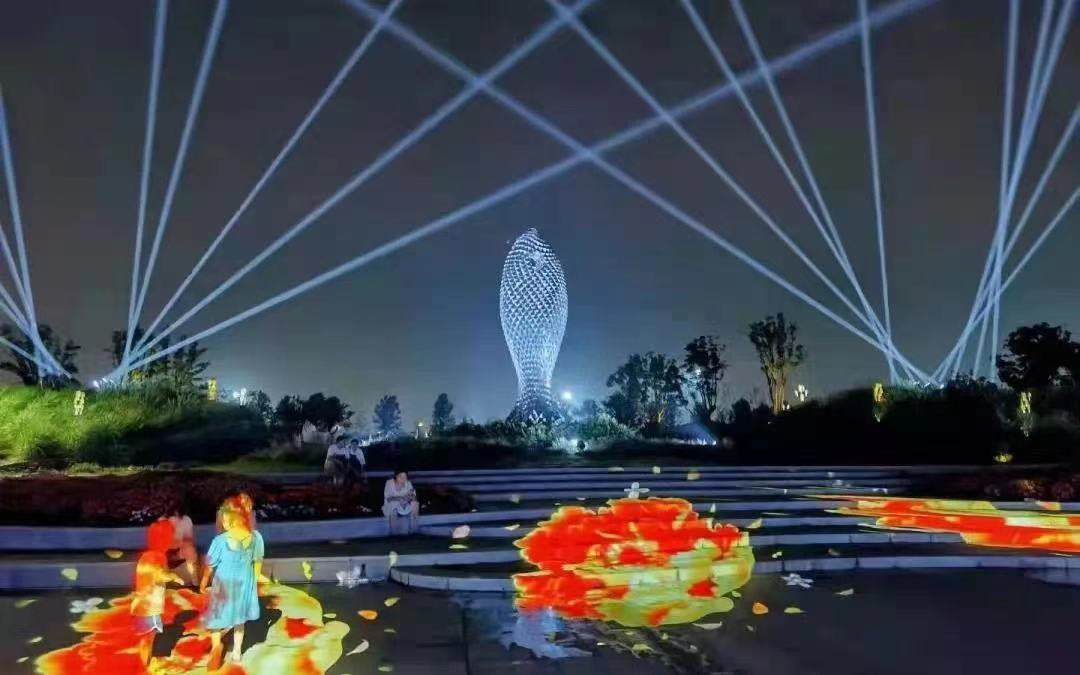线条优美的鲤鱼雕塑伫立在浦南运河边,反光的鱼鳞在彩灯的照射下熠熠生辉,就像是一条鲜活的鲤鱼跃出了河面。两侧的射灯直穿云霄,在夜空中编织出一张巨大的渔网,前面的台阶用图案灯打亮,变幻的色彩与雕塑相辉映。和鲤鱼遥相呼应的河对岸矗立着一扇由灯光组成的“龙门”。
