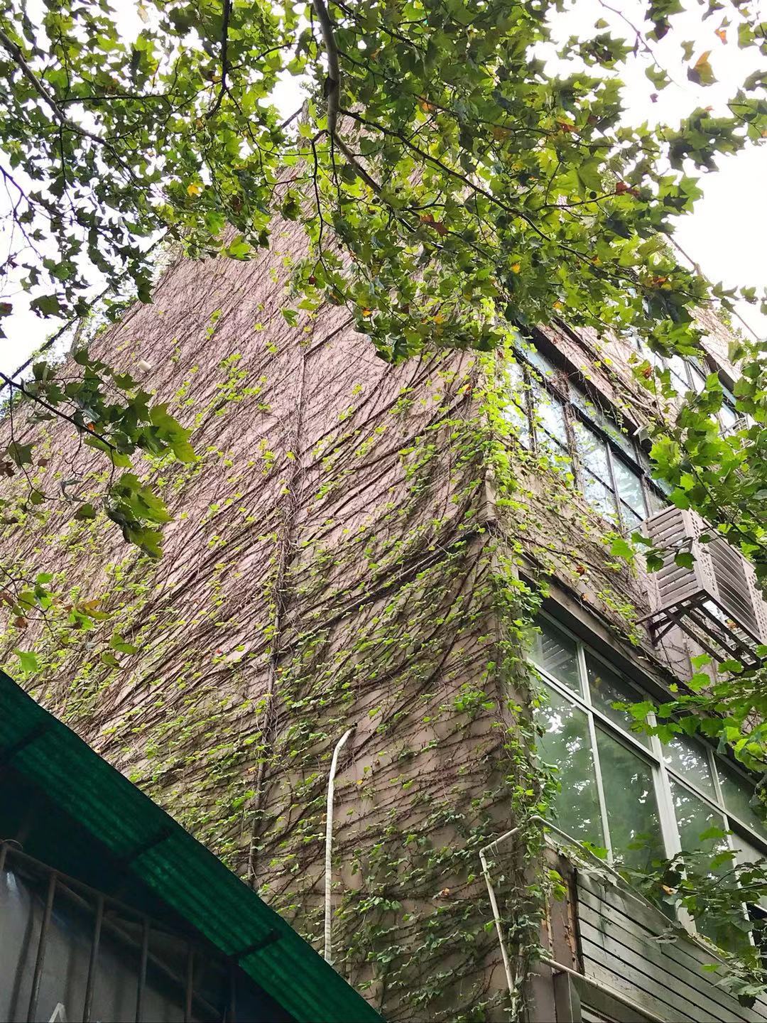 不经意间抬头仰望,一簇簇藤蔓爬上延平路旁的居民楼,构绘了一幅绝美的绿色自然墙画,令人顿时心旷神怡。正是午餐时间,居民楼下的上海老风味“黄鱼面馆”人头攒动,旁边的水产小店也断断续续地吆喝着“掉脚蟹便宜卖”。
