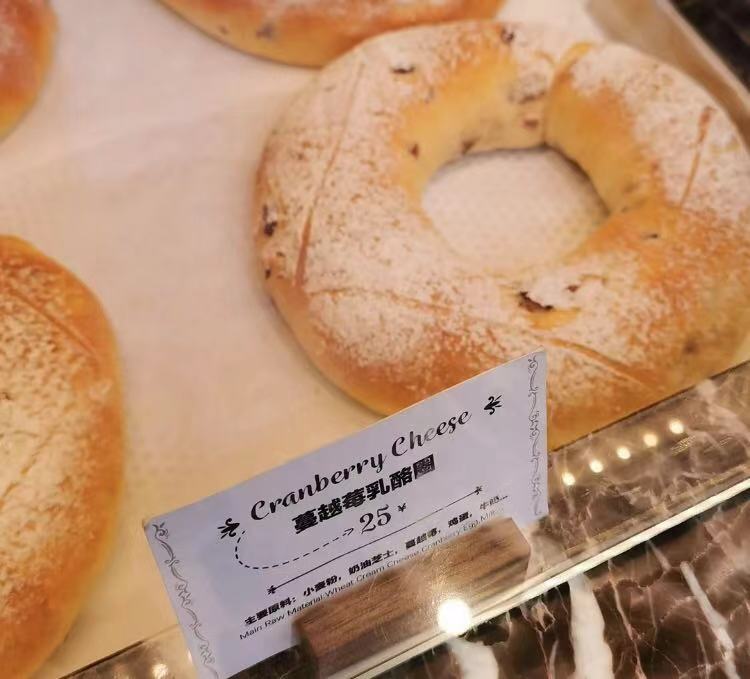 店里还有不少座位可供堂食:“来一个招牌太阳面包,这里吃。”于是,托着太阳面包的盘子便从面包区传送过来了。当然,你也可以选择落座半户外的吧台,一边吃东西一边看街上人来人往,来一个蔓越莓乳酪圈,很是惬意。