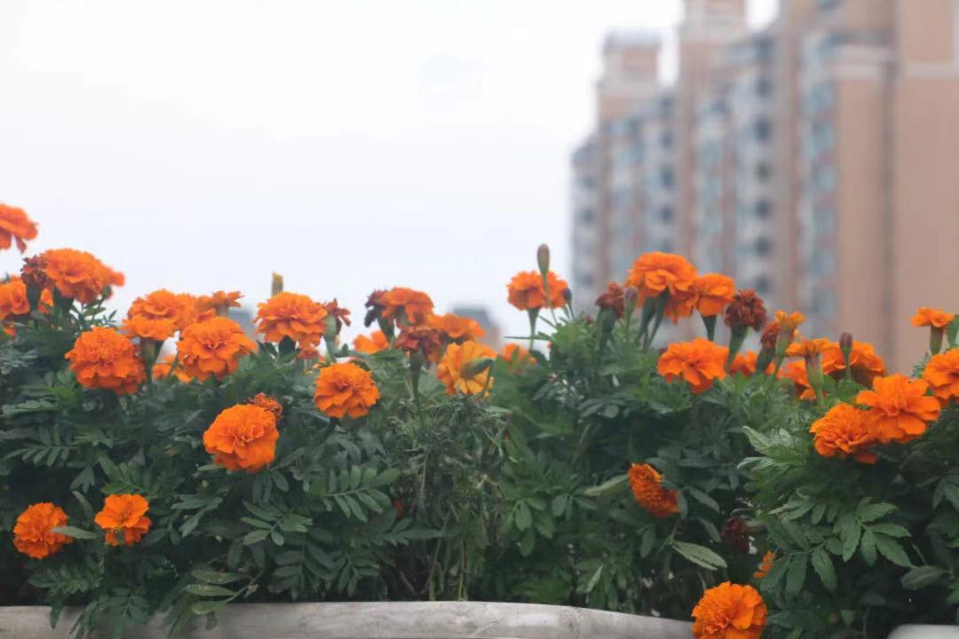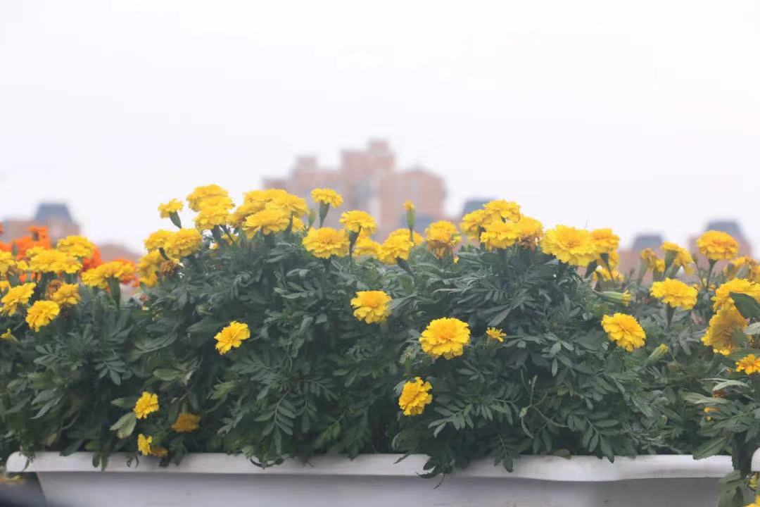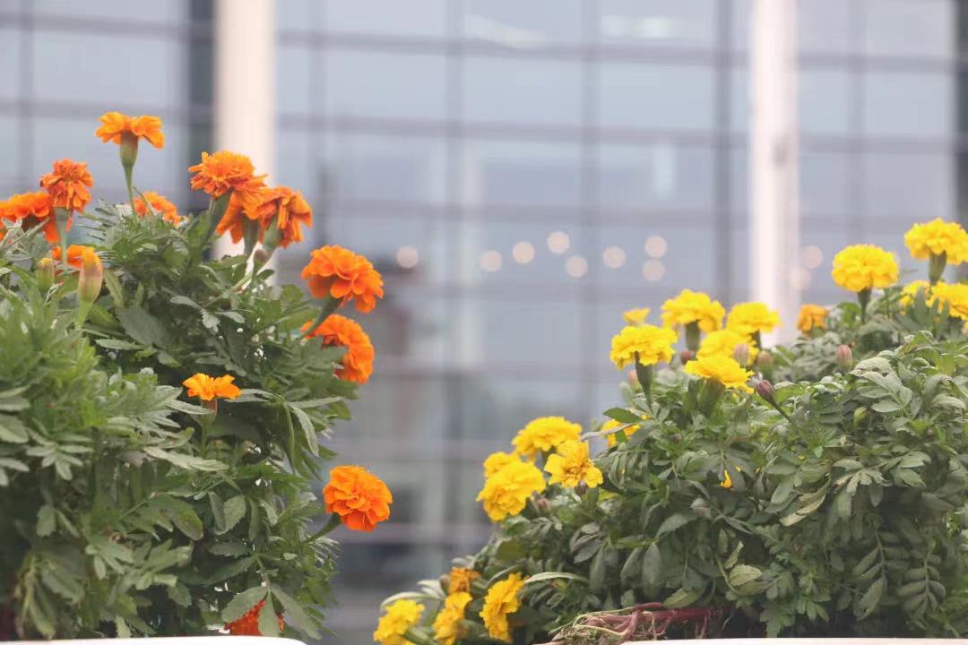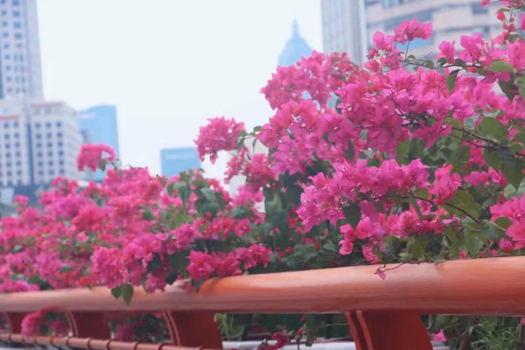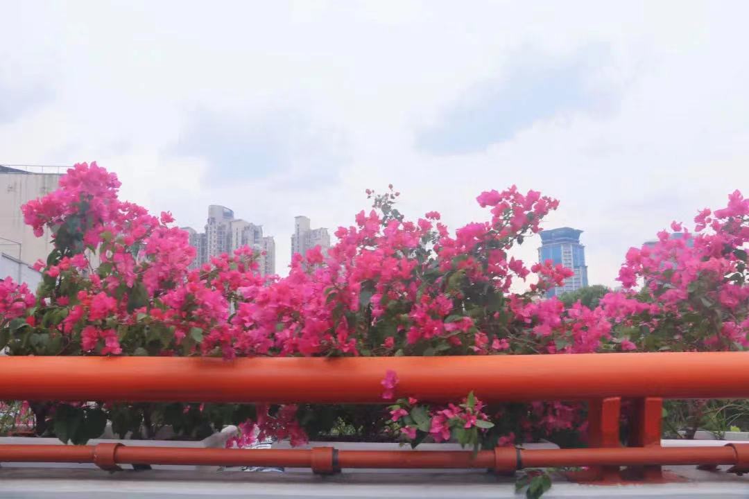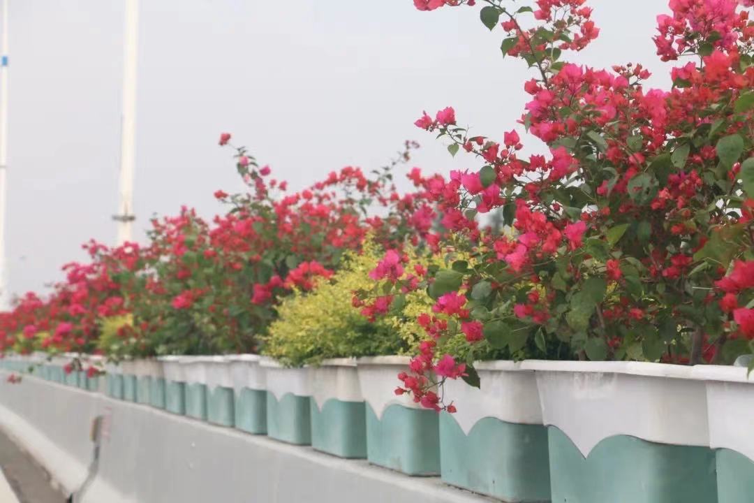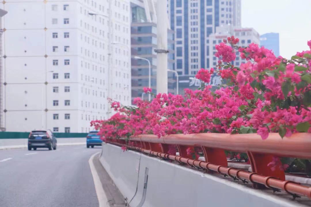 近三万盆花被摆放在高架道路护栏上,红色、黄色、粉色的花卉层层叠叠,晴朗的天空成了最美的底色。