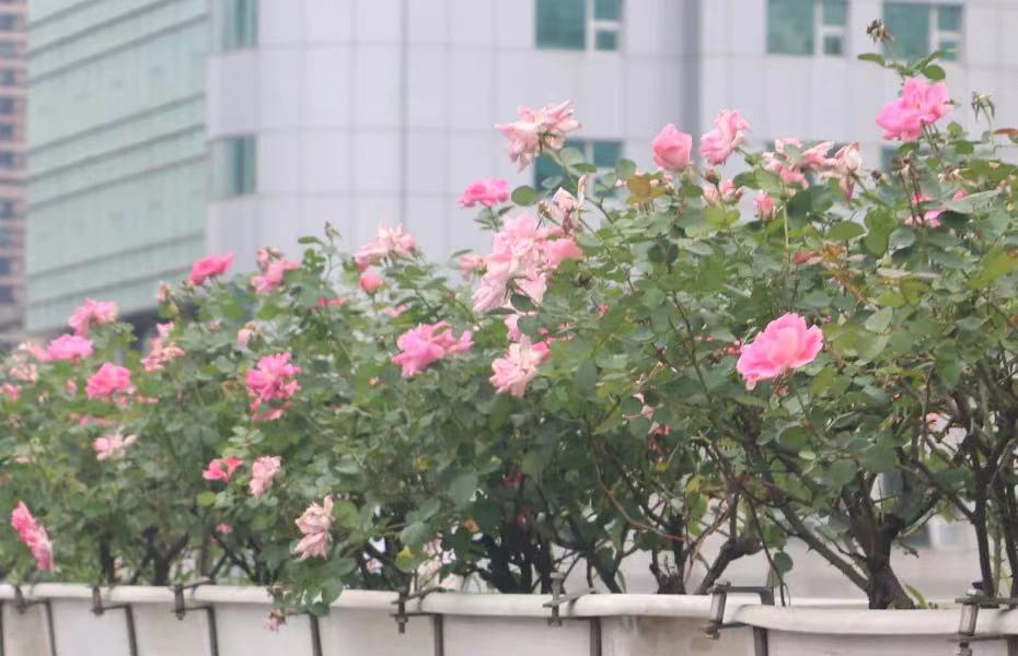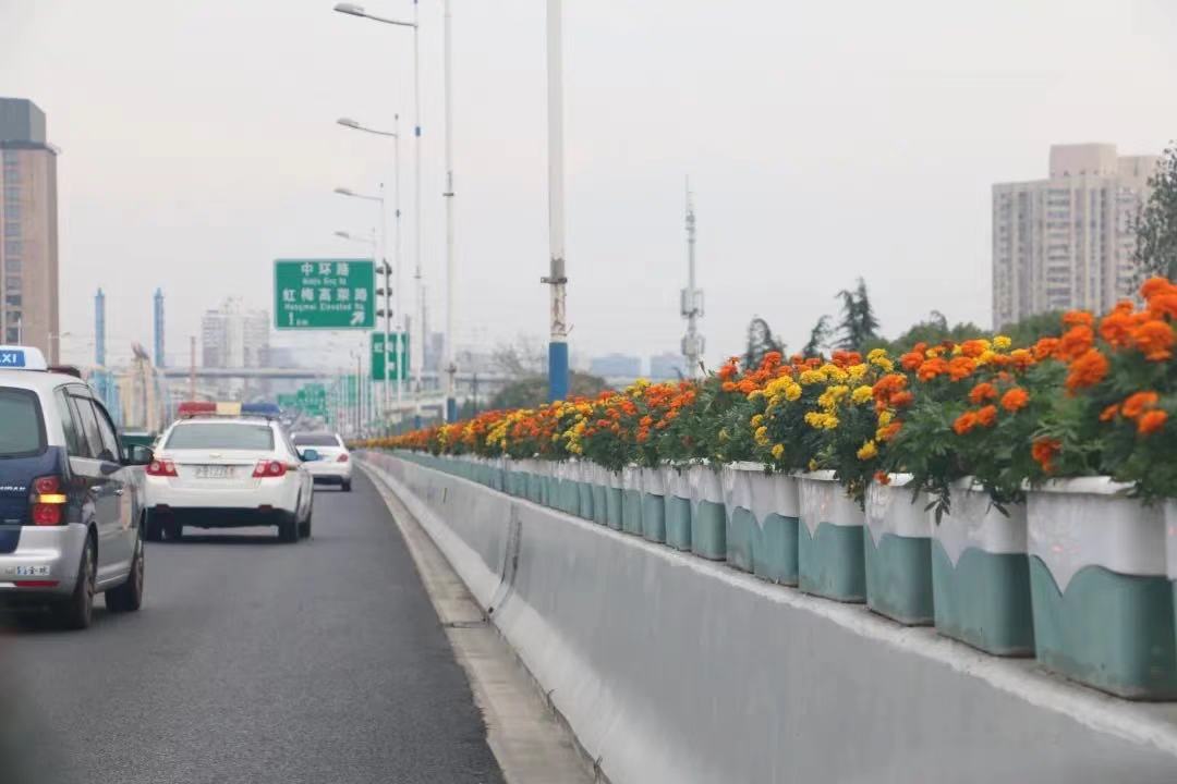 沪闵高架路配花品种以月季“仙境”为主,部分路段的摆花采用三角梅+亮金女贞组合、橙色孔雀草+黄色孔雀草组合。