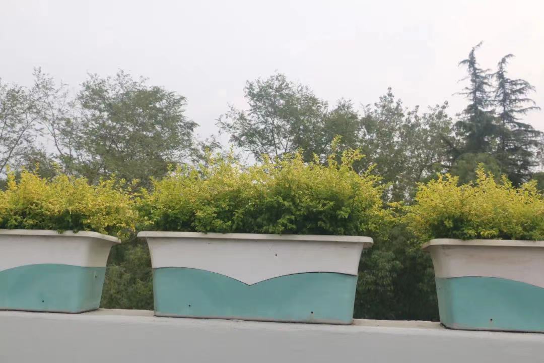 延中立交至延西立交采用组合摆放,运用5盆比哥海棠红花绿叶+3盆亮金女贞组合模式进行摆放。