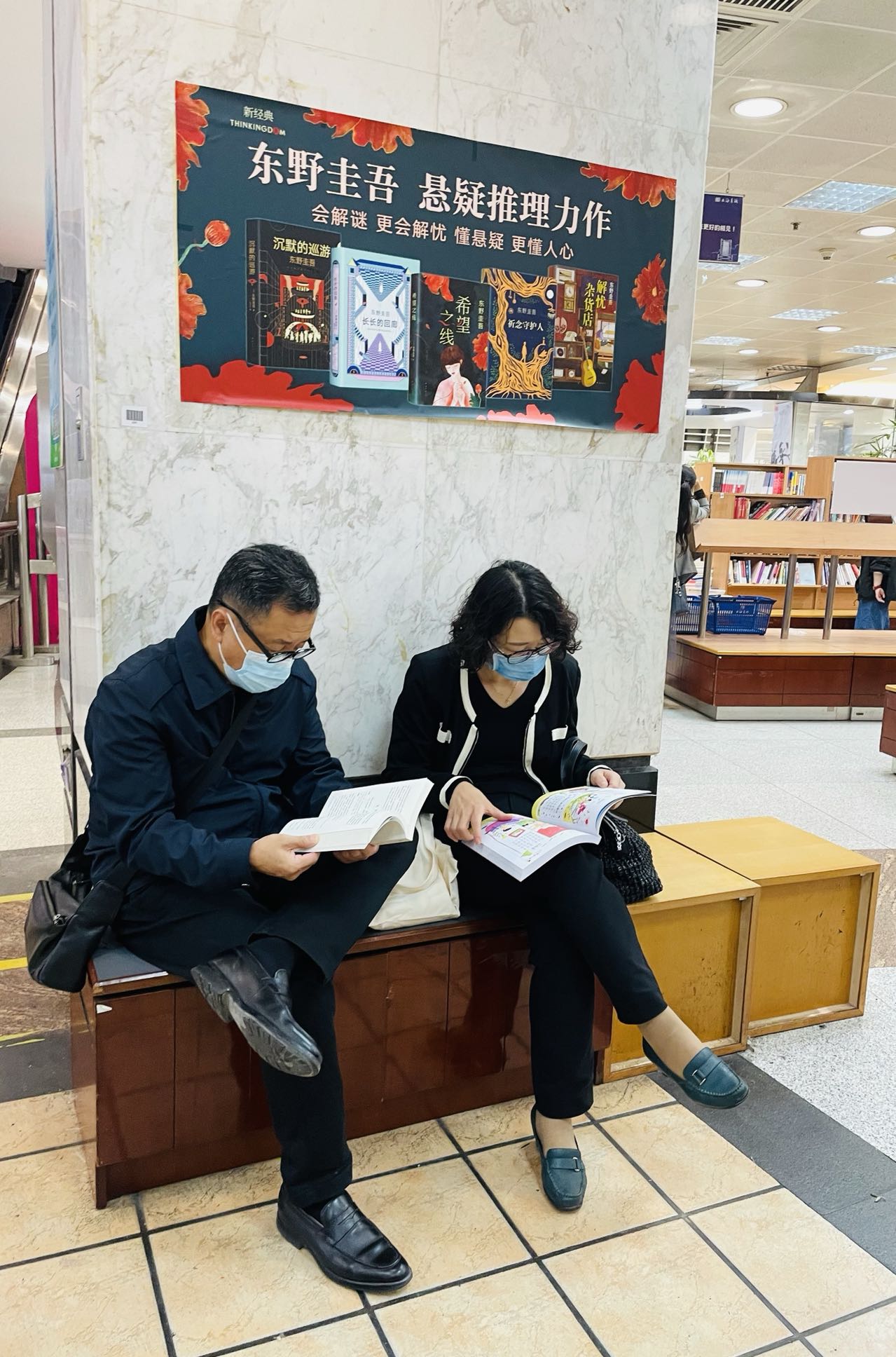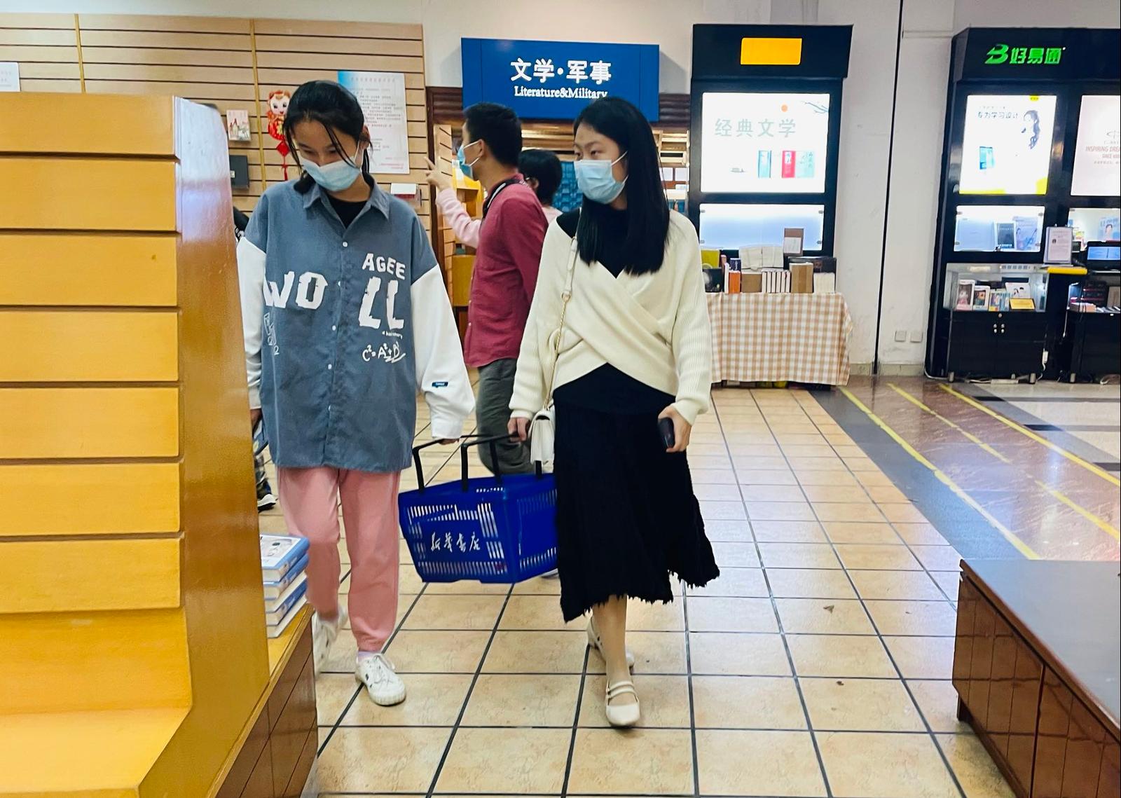 也有闺蜜俩一起拎着篮子边轻声聊天边挑书。