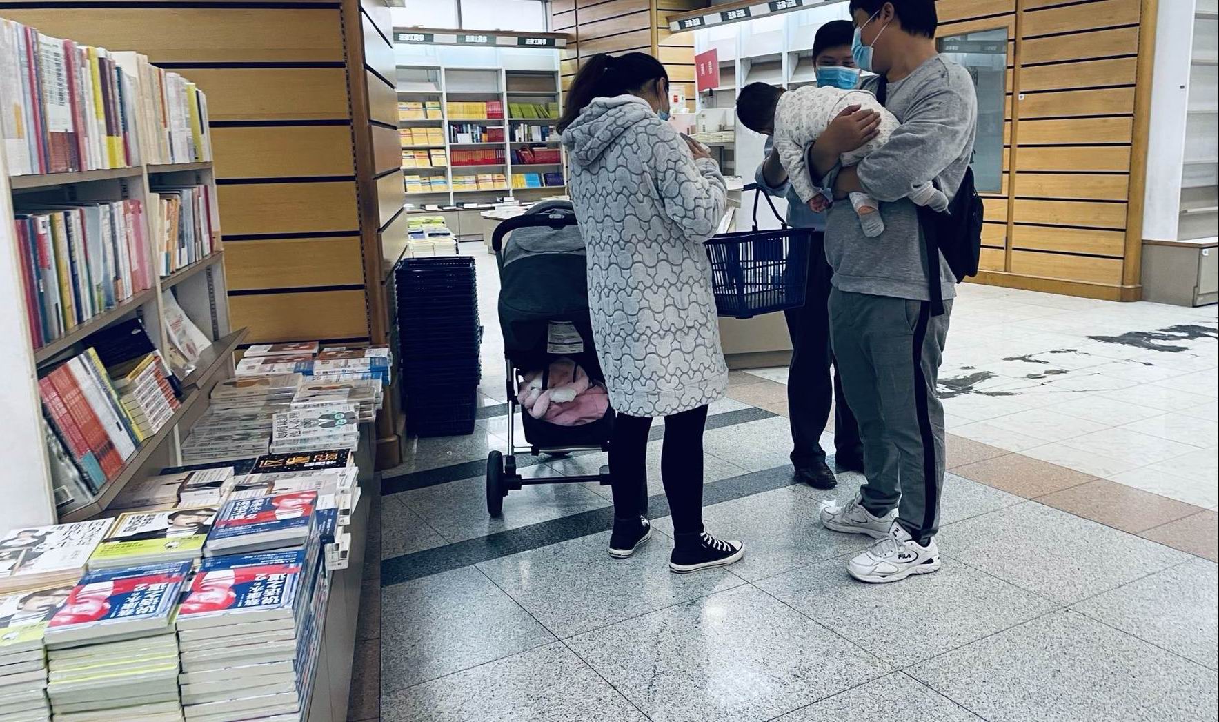 还有把孩子放在推车里,孩子想看的书就自己拿在手里,大人则推着车帮孩子选。