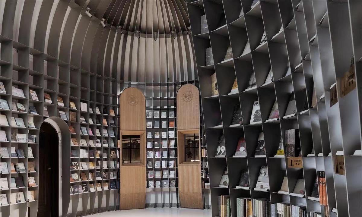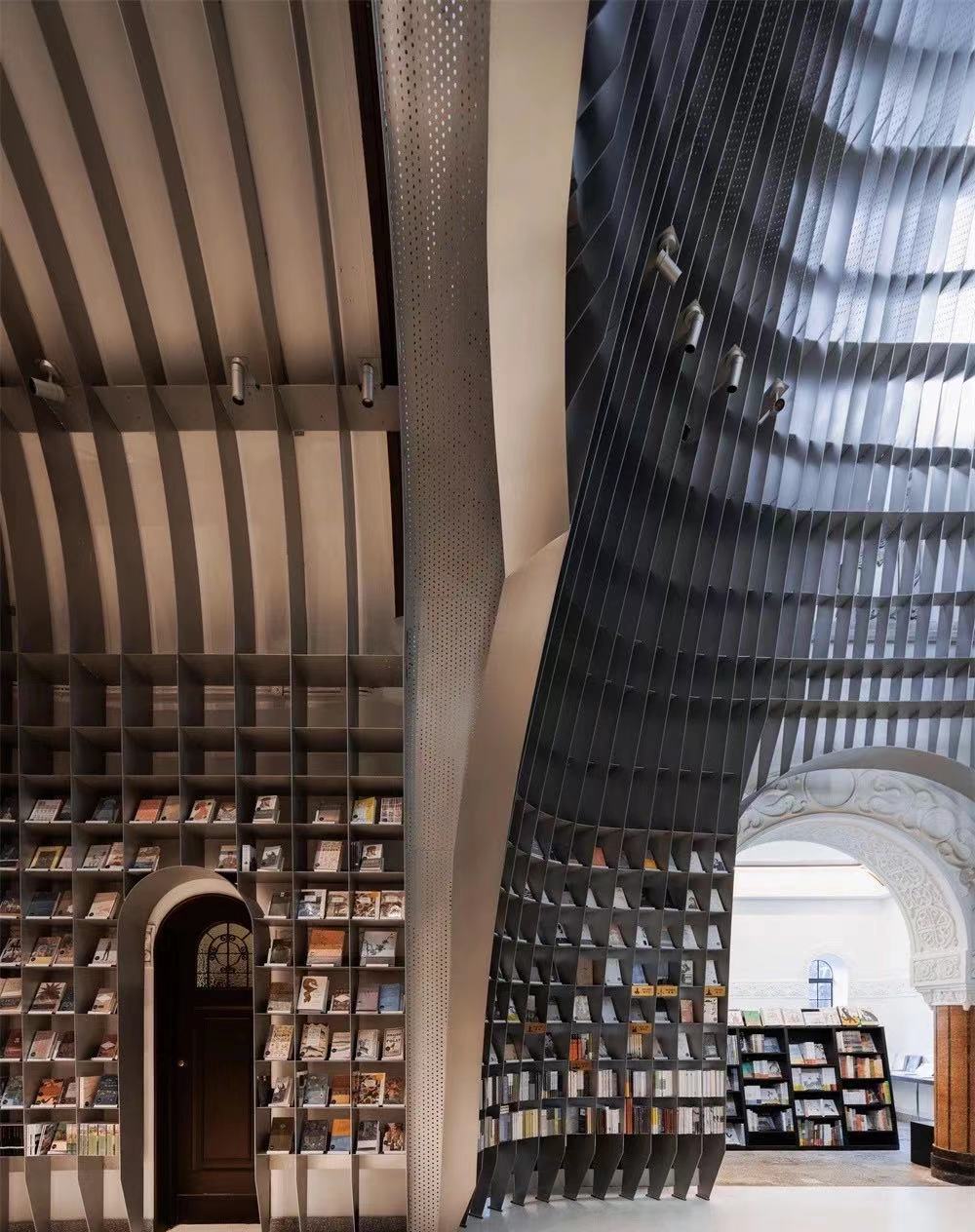与砖石砌筑的教堂旧址不同,设计师俞挺用银光闪闪的钢板打造了思南书局·诗歌店。书架的隔板和立档都是全焊接钢板网格结构体系的一部分。书架没有背板,穹顶的光线依然可以洒入书店。书架还隐隐约约露出教堂旧址不同年代的痕迹,包括那组21世纪初作为餐厅时,老板请美院学生绘制的天主教风格壁画。这样钢铁书店和砖石教堂就成为一个新的整体。