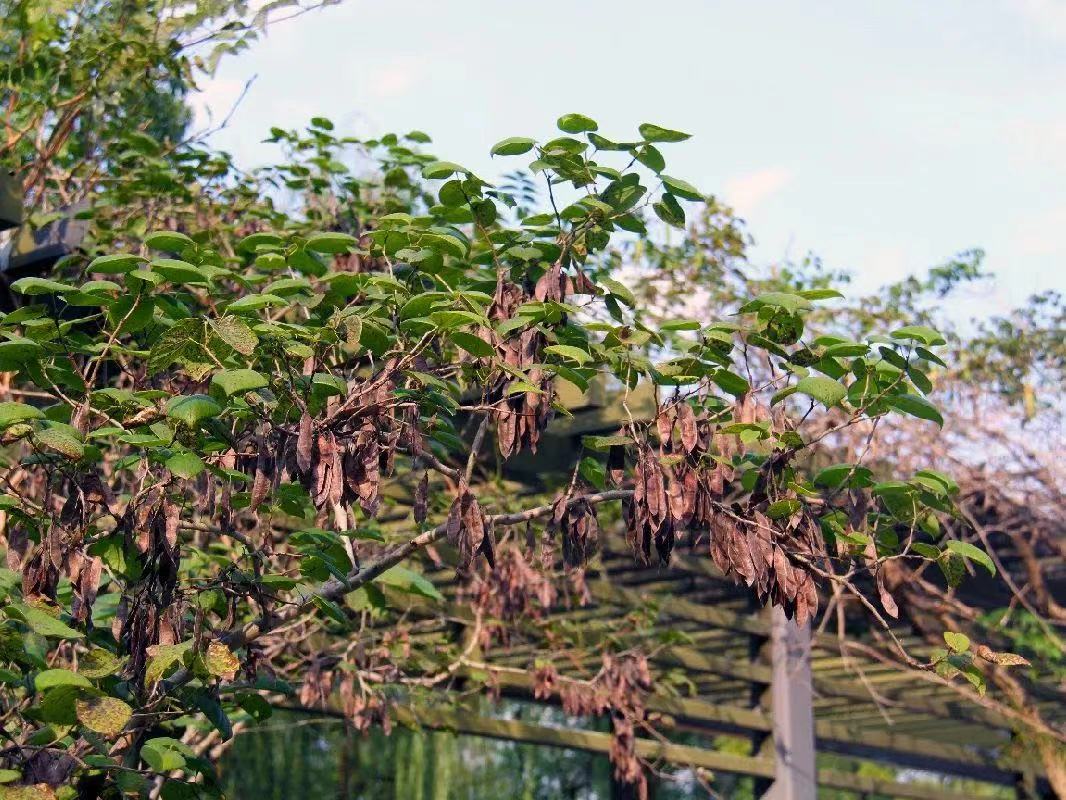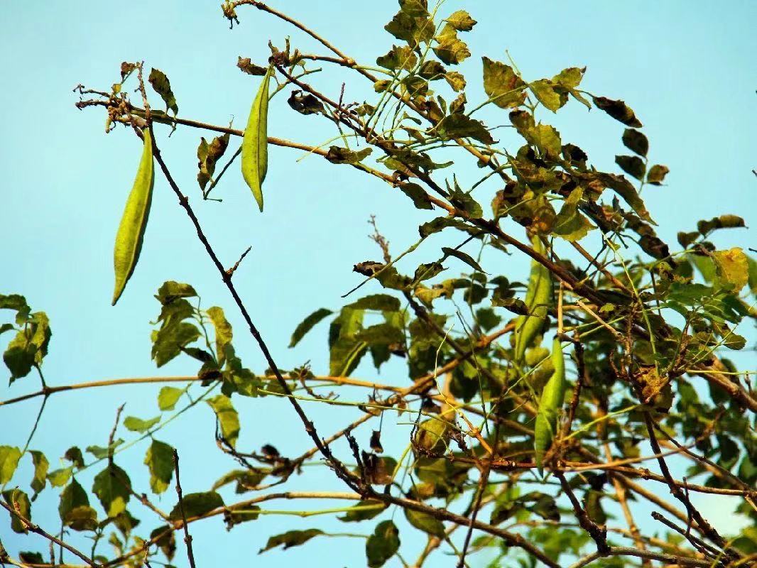 紫荆的果实又扁又狭长,挂于主干上荡漾。